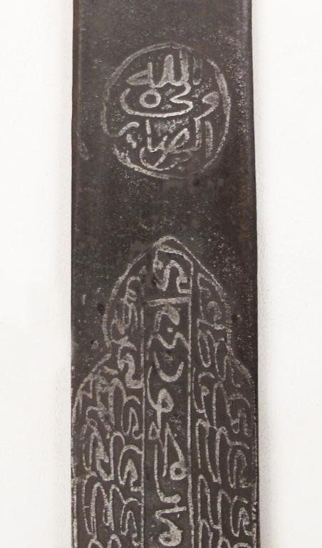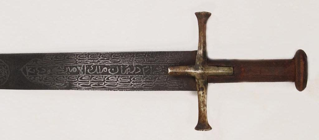 With wooden grip and brass crossguard. The long, straight, double-edged blade of above-average quality, etched with Arabic calligraphy, including ALLAH! and a partially legible inscription, possibly the owner's or maker's name '' IN OMDURMAN AL MALIK AL AMAR MAHMUD 1304 a.h.'[1886/87c.e.] Muhammad Ahmad, known as the Mahdi, made Omdurman his military headquarters in 1884; it remained the Mahdist capital until 1899. Dated 1886/87.Grip-wrap lacking .Overall length 105.7 cm. Condition III