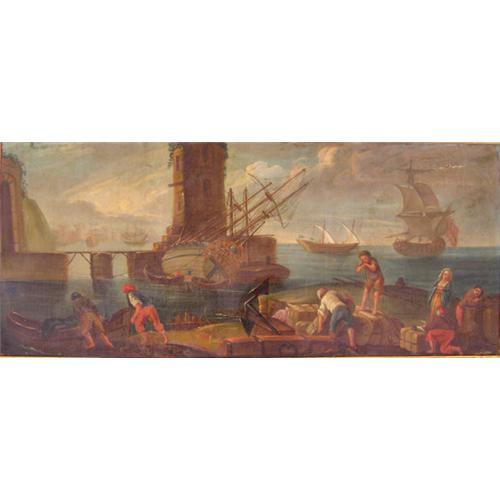 The painting developed in horizontal show a busy harbour foreshortening perfectly. The first floor, almost as though we were looking at a stage, we notice men engaged to perform the most disparate harbour incumbencies: sacks to be unloaded, anchors to be cleaned, the women who wait to be able to buy the unloaded goods just. A scene which strikes for the detail multitude, realized abundance and attentions, make the user's glance wander from all sides Background we find a tower, probably a building to defensive purpose realized with technique and search for the lyric detail, as for the vegetation which comes out of the roof. In bass notice a merchantship of which one sees she decorated stern (or stern castle), while garaging. And even more pushed in depth anchors in a plan, galleons which are going to horizon. The composition appears lyrical, and balanced by use of light colours, that growns up greys and cyanes.