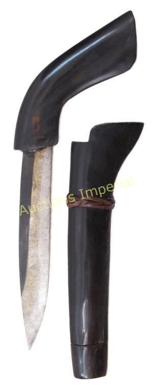 With horn grip and sheath and straight blade. Mid 20th century. Overall length 18 cm.