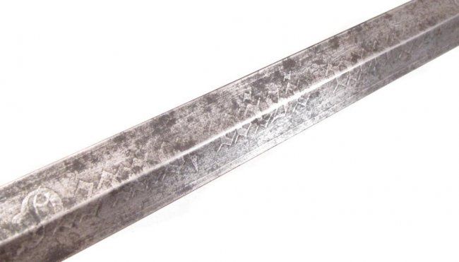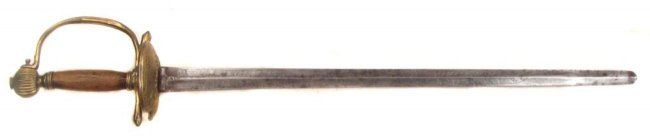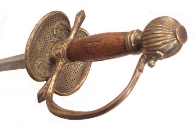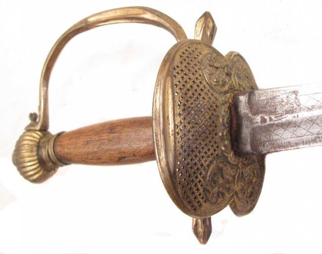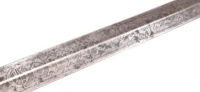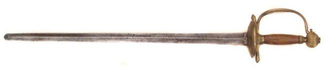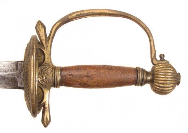 A well-made example, apparently a privately-purchased British 1796 Heavy Cavalry Dress pattern, with finely fluted guard and pommel, and pierced and embellished clamshell guard, of copper with most original gilding intact, the wooden grip lacking its wire wrap. The straight, double-edged blade with central ridge, and an etched panel to either side. On the right, GEORGE BYRON, on the left, NEMO NISI MORS [No One Except Death {Will Part Us}]. Shortened to trophy length after its acquisition.Beginning of the 19th century.Age toning to blade. Overall length 61.5 cm. George Gordon Byron, Sixth Lord Byron, was one of England?s greatest Romantic Era poets. He led an adventurous, often dangerous, existence and at age 35 journeyed to Greece to join the revolution and fight the Ottomans. Given command over a brigade of Suliots, he was preparing an attack on the Ottoman stronghold of Lepanto, but died from a fever in Missolonghi on April 19, 1824. Byron?s passing was mourned throughout the world. He became a national hero to the Greeks and his renown as a poet grew in England, Europe and America. Robert Elgood, in his monumental work, The Arms of Greece and Her Balkan Neighbors in the Ottoman Period (N.Y., Thames & Hudson, 2009, p. 275 and 333,) notes three swords which are attributed to Lord Byron; all appear to be of the 1796 Heavy Cavalry Officer?s Dress type. This example alone bears Lord Byron?s name etched on the blade, together with a motto which is entirely consistent with his Romanticist philosophy and no doubt spoke to his love of Greece. Condition IV