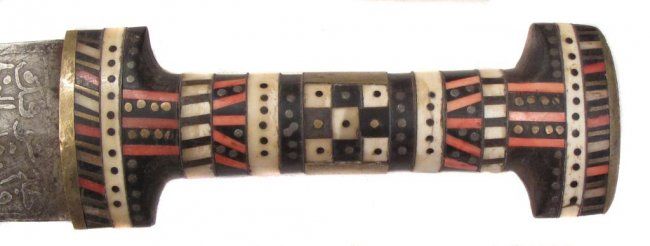 With inlaid hilt and etched blade.In its brass sheath.Early 20th century.Minor losses.Overall length 34 cm.