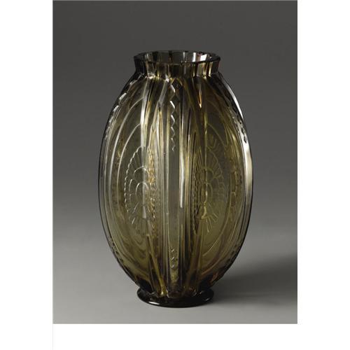 <B>A French Glass Vase</B></I><BR><BR>Sabino, France<BR>Circa 1930<BR>Smokey glass<BR>Marks: incised <I>Sabino / France</B></I><BR>11 in. high<BR><BR> The lobed form in smokey gray glass molded with a pattern of stylized flowers and geometric forms <BR><BR><B>Importan