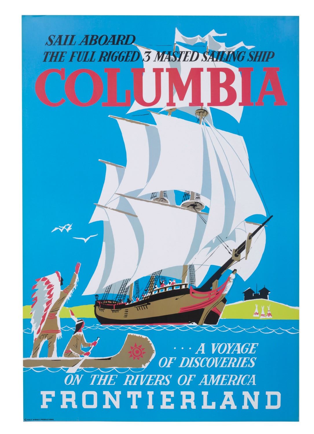 (Disneyland, 1990s) A limited release Sailing Ship Columbia attraction poster reproduction from The Disney Gallery in New Orleans Square. For a very short time, the Disney Gallery exclusively offered colorful limited edition full-size reproductions of posters for timeless Disneyland attractions, as this original design by Imagineer Bjorn Aronson. The print measures 36"x54" and is in very good condition with minor wear to some edges and corners.