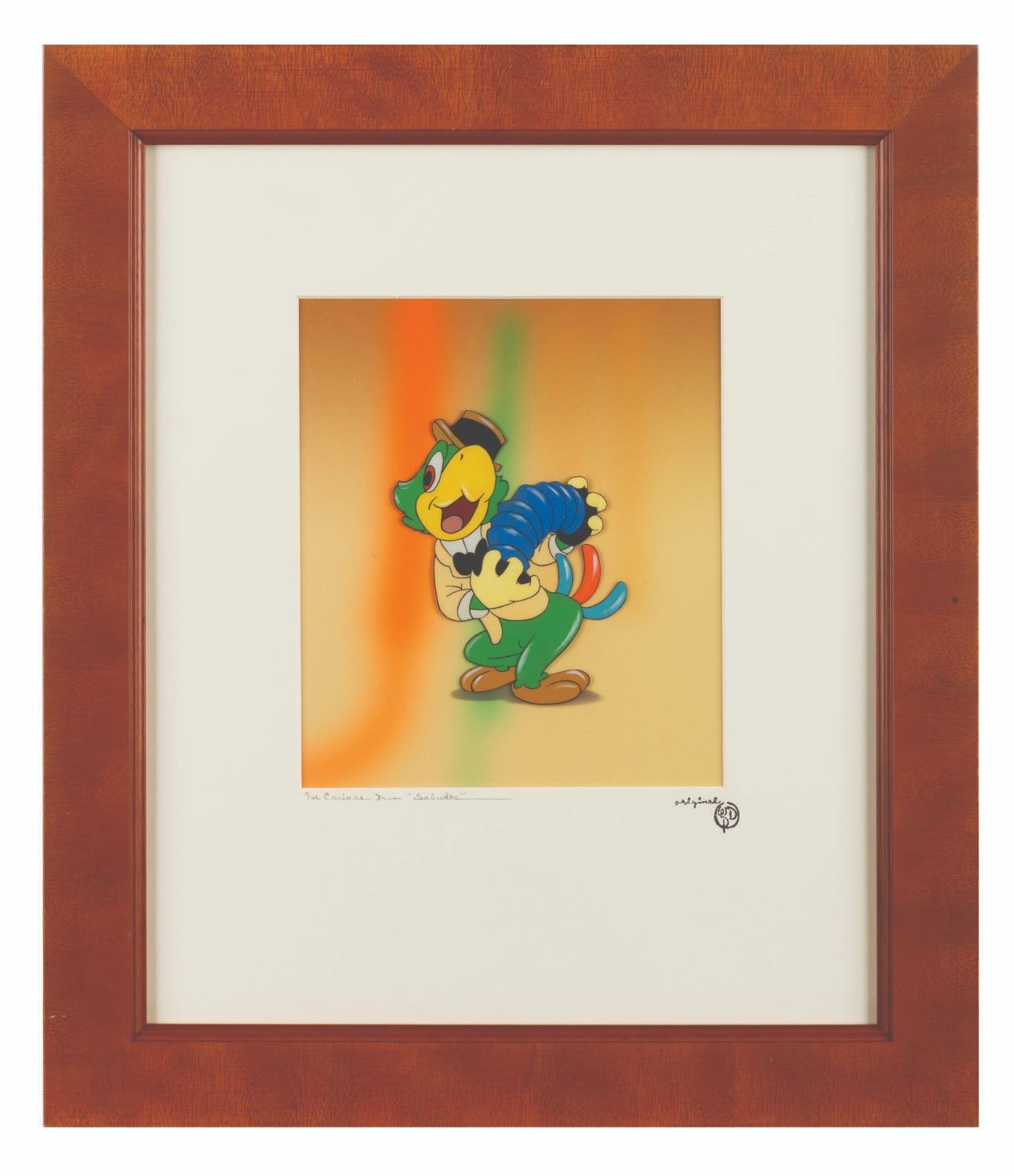 (Disney, 1942) An original Jose Carioca production cel from "Saludos Amigos.” The cel has been trimmed to the image and applied to a custom airbrushed background as prepared by Courvoisier Galleries for sale. Jose has an image size of 3.5” x 4.5” on a 6.25” x 7.25” visible background. The entire framed and matted piece measures 14” x 16”. The cel displays in very good condition with light warping, scratches, and wear from production use. The framed matte is in very good condition with light wear.