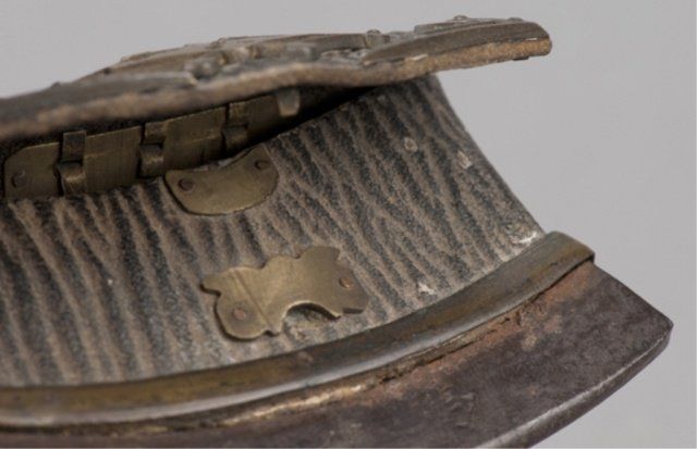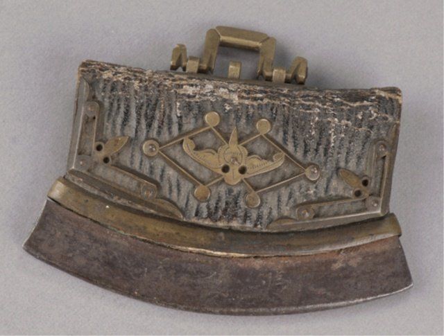 A Samurai pouch and flint in brass, steel, and leather, an inscription on the steel portion. The Helen & Jack Mang Collection S. Kriger, Inc. Washington, DC