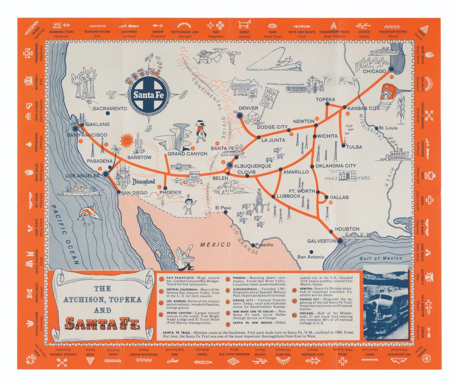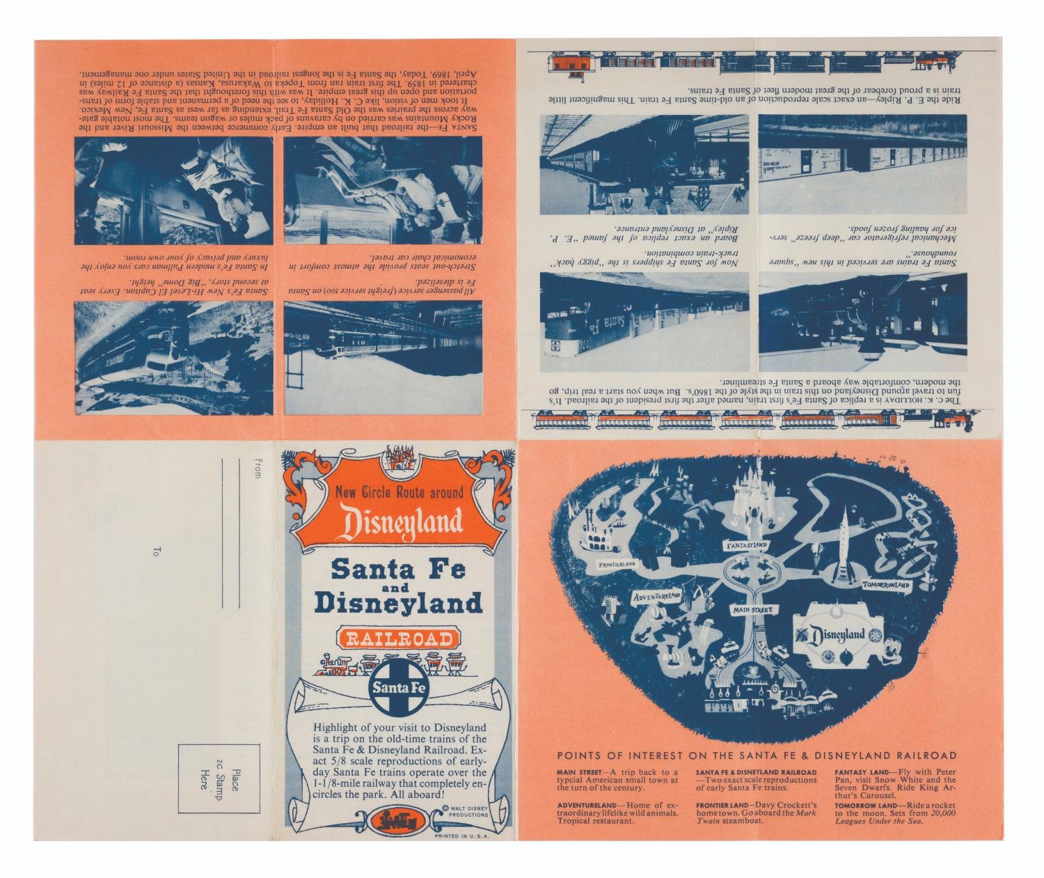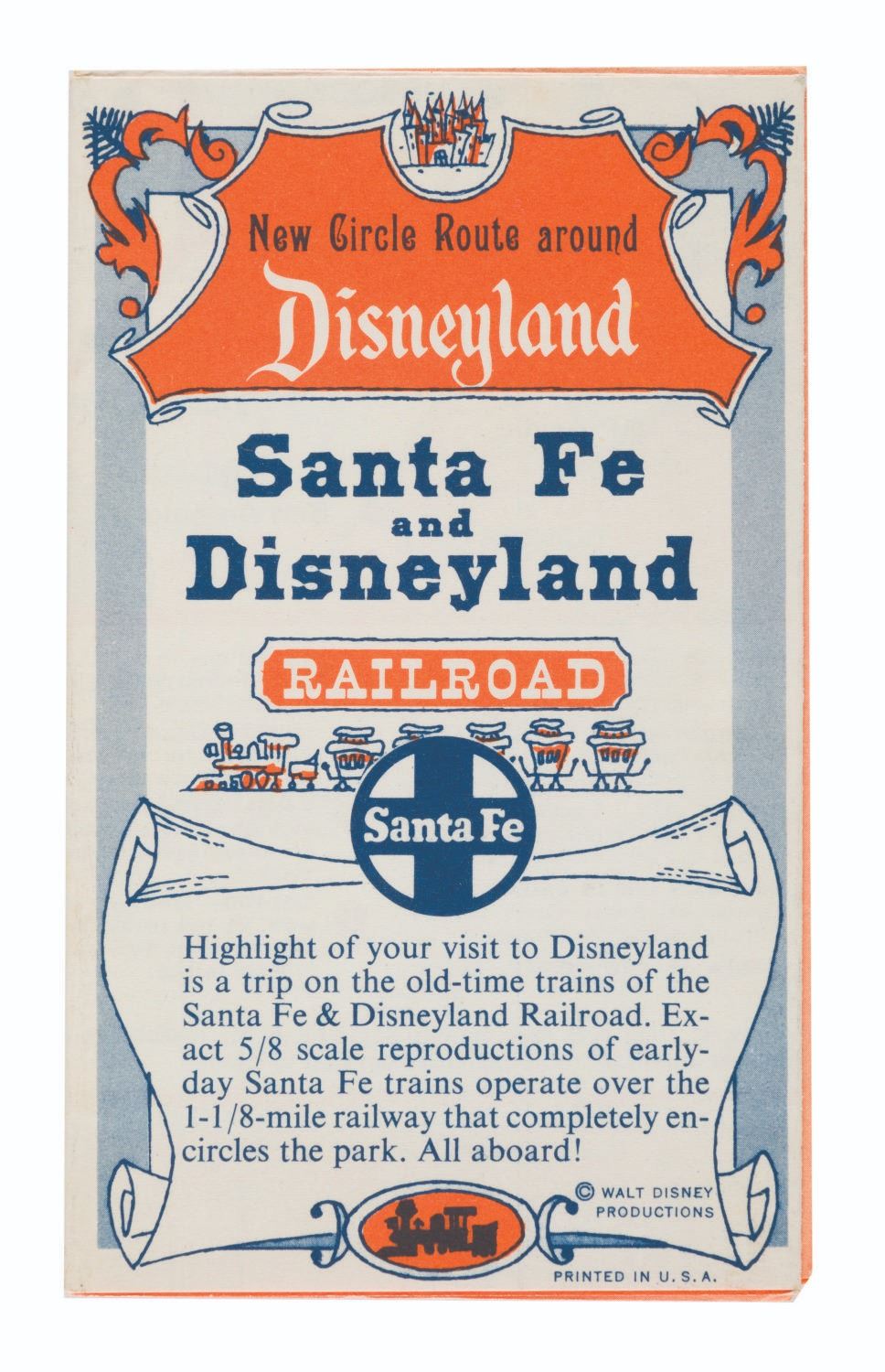 (Disneyland, 1950s) A Santa Fe and Disneyland Railroad brochure outlining the Disneyland Railroad and its stations. The brochure unfolds to a map of the Atchison, Topeka, and Santa Fe rail service across the United States. Measuring 5" x 3" when folded, the piece is in very good condition with small creases along original folds and minimal wear.
