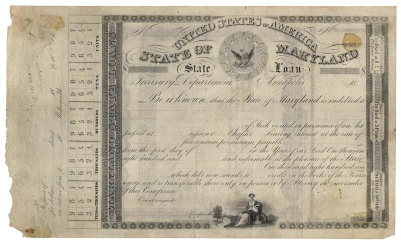 1840’s. Annapolis, Maryland. Unissued State Loan. Vignette of the State of Maryland Seal depicting an eagle at top center, Seated figure at bottom. Printed by Danforth, Bald & Co. & Toppan, Carpenter & Casilear Co. The bond was intended to be sold in Europe as well as the United States as par is fixed in Pounds Sterling, French Francs and Dutch Guilders. Mounting glue traces on verso bleed through and are visible from the front in all four corners. A very scarce early U.S. state bond. Uncancelled. VG-Fine.