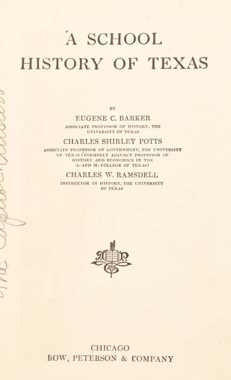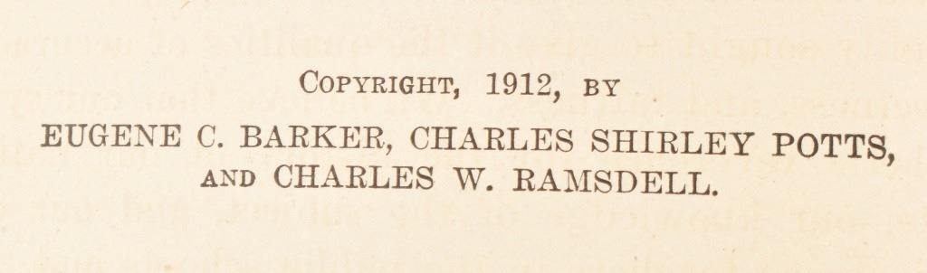 by Eugene C. Barker, Charles Shirley Potts, Charles W. Ramsdell, professors at University of Texas. 1912 edition. published by Row, Peterson & Company, Chicago.