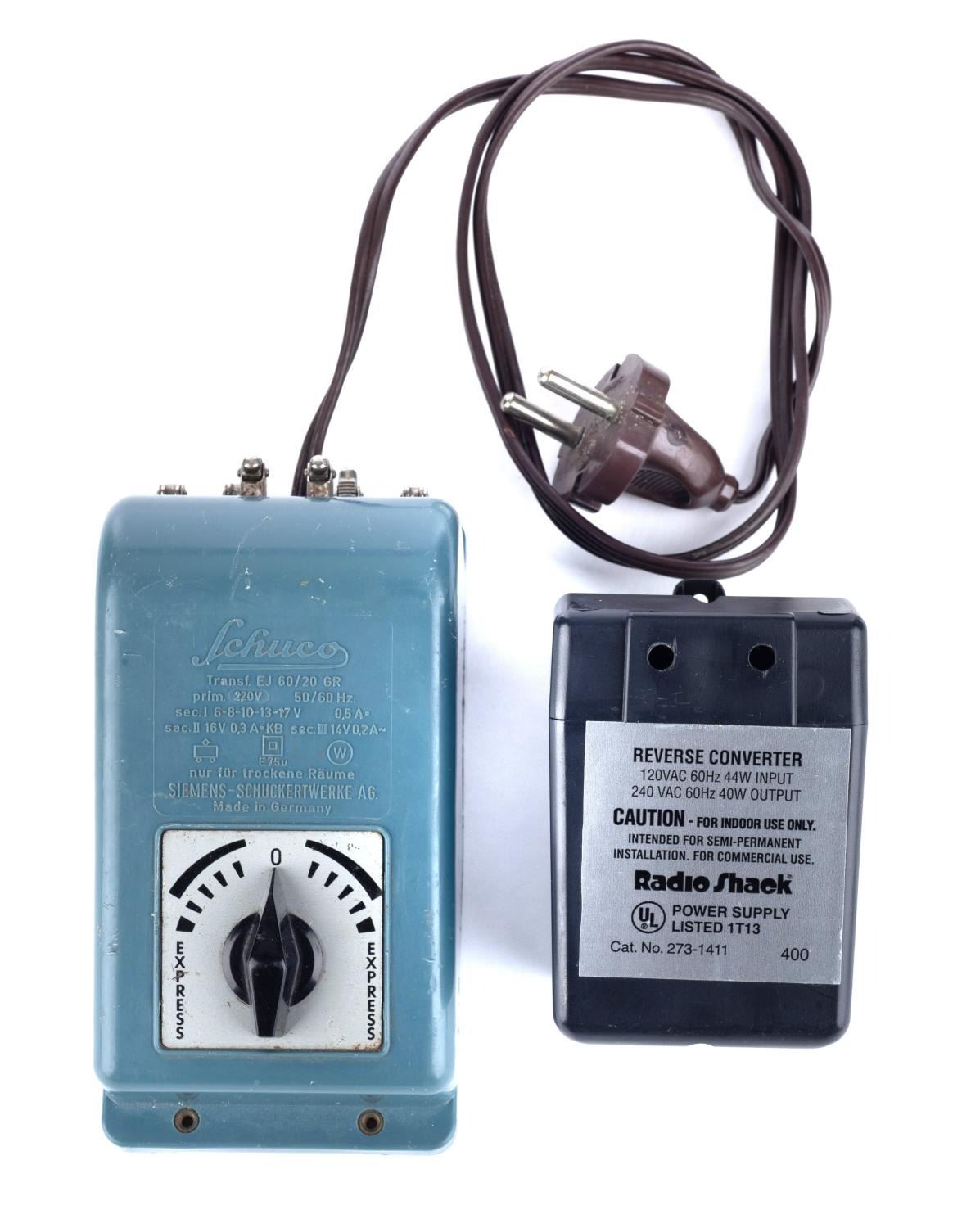 (Schuco, 1967) A Schuco Transformer for use with their Disneyland Alweg-Monorail set. Transformer EJ 60/20 GR is marked as 220V and 50/60 Hz. This comes with a Radio Shack Reverse Converter of a later manufacturer. The pair appear in good condition with wear from use. The electronics have not been tested.