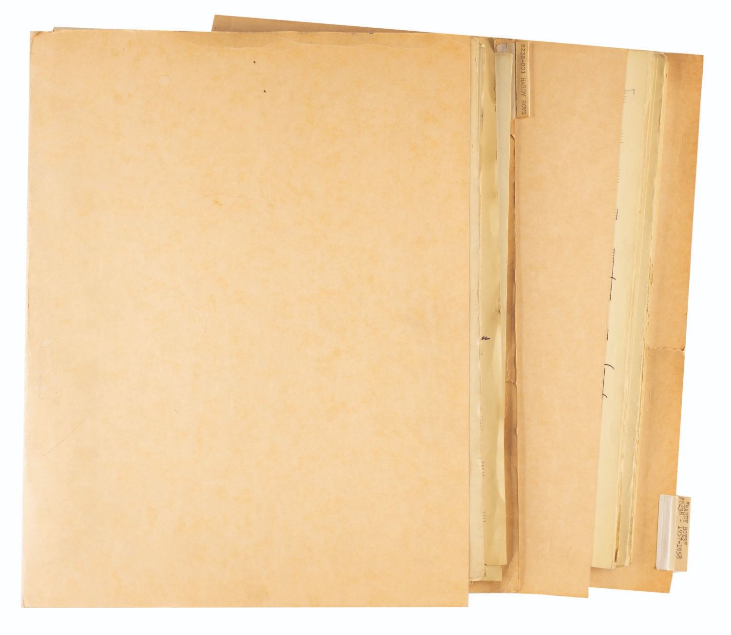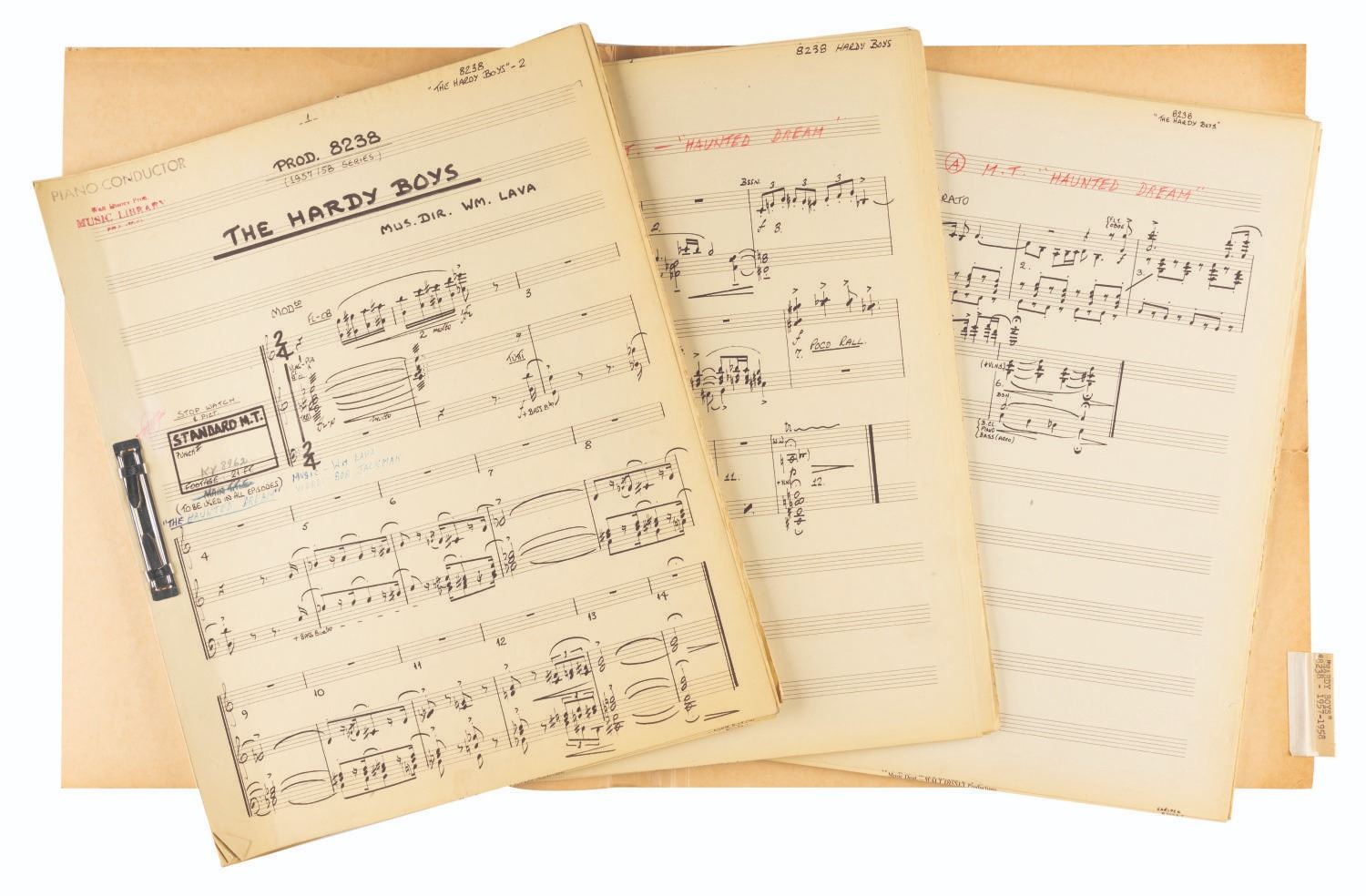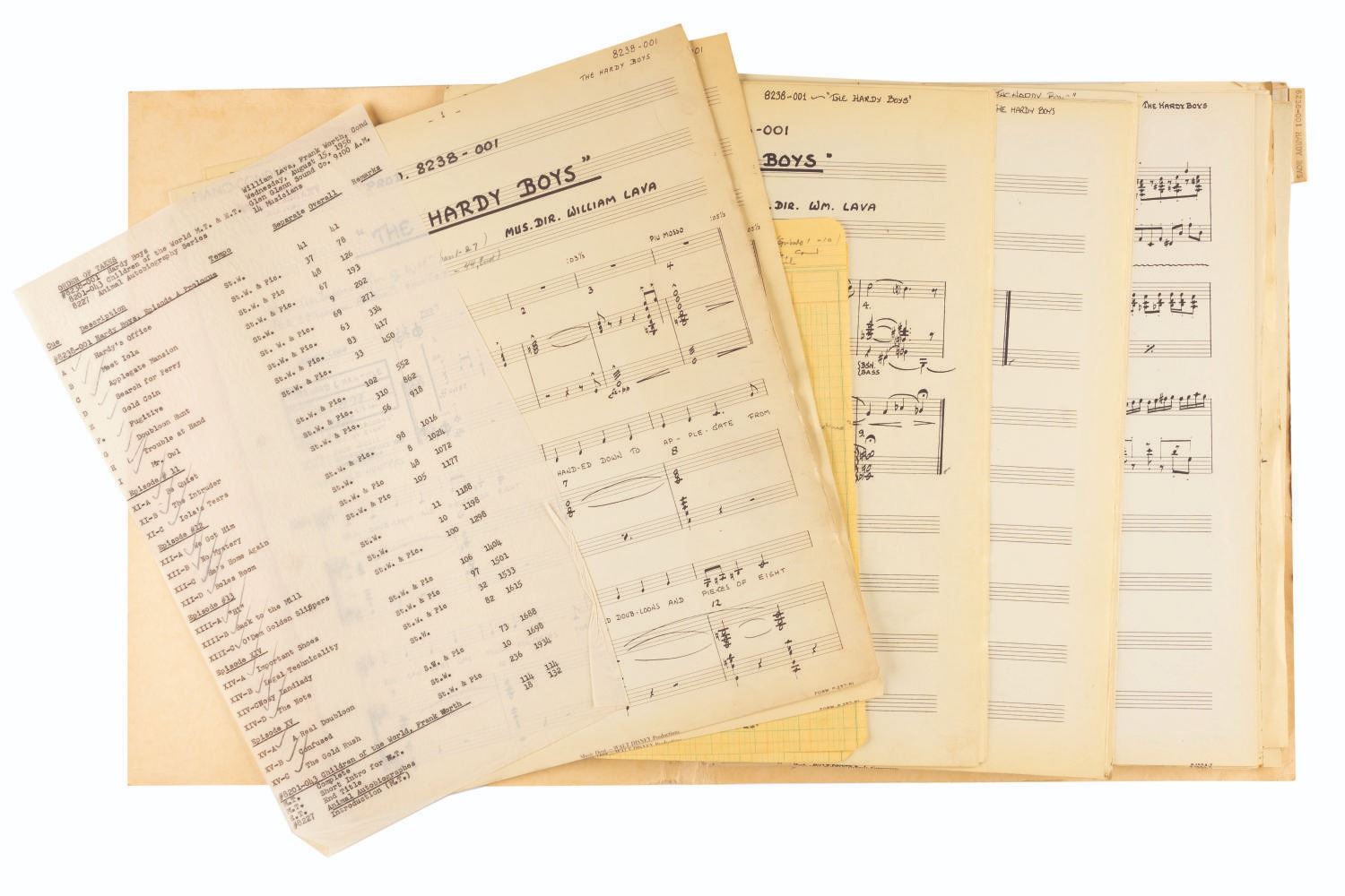 (Disney, 1956-57) A collection of scores from two Hardy Boys television serials that aired during “The Mickey Mouse Club.” The first Hardy Boys serial, “The Tower Treasure,” aired in 20 parts during 1956, while the second serial, “The Mystery of Ghost Farm,” aired in 15 parts in 1957. Also included in the lot are a setlist from a 1956 recording session and an inter-office memo with notes on the score. Ranging in size from the 5.25” x 8.5” memo to the 11.75’ x 14.25” sheet music, the items are in good to very good condition with light creases, tape on the spine from production use, wear, production notations, and discoloration from age.