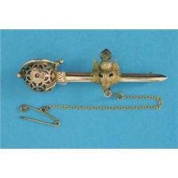 A Scottish yellow metal and hardstone brooch, in the form of a claymore sword, the blade applied...