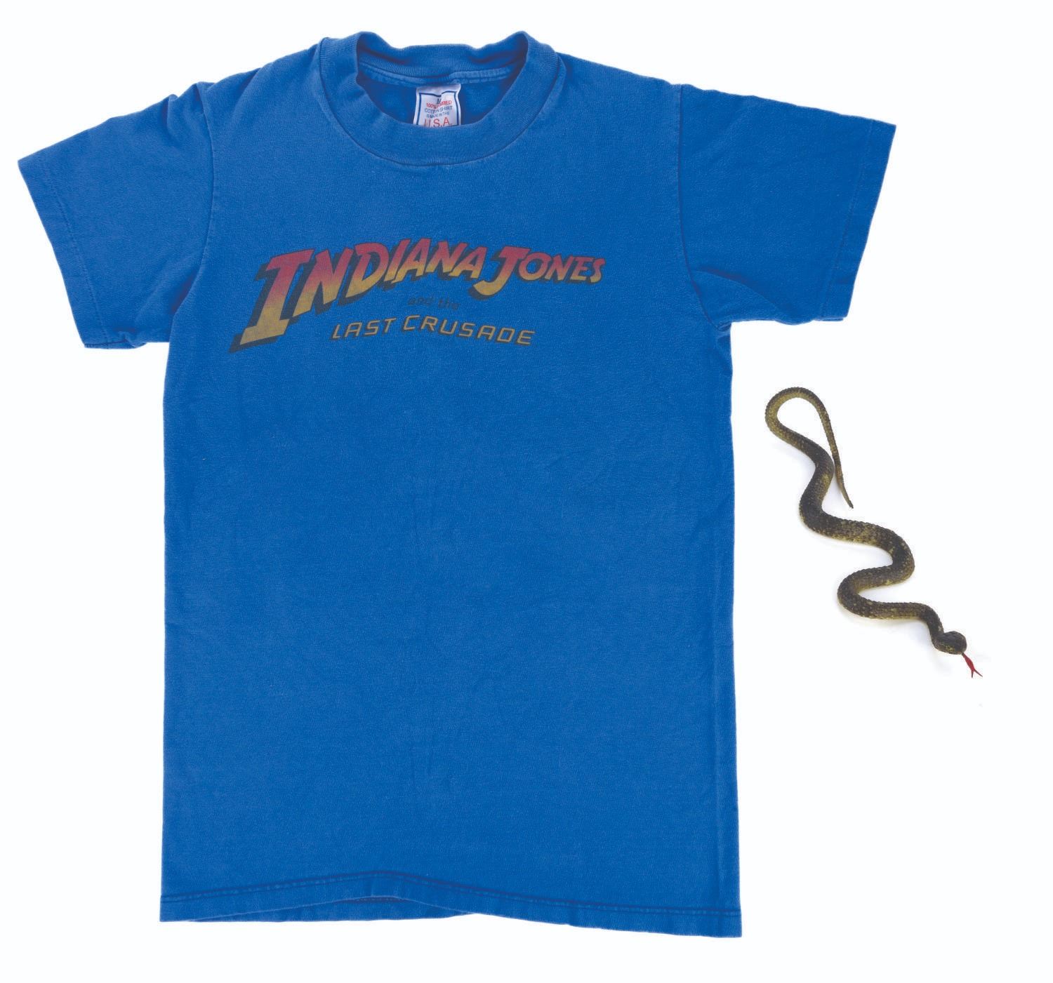(Paramount, 1989) A screen-used snake prop and crew t-shirt from Indiana Jones and the Last Crusade. In the opening scenes of the film as young Indiana Jones (played by River Phoenix) is chased across a circus train, he falls into bins holding hundreds of snakes, developing his signature fear. While many live snakes were used in this scene, their numbers were bolstered with rubber snakes, including this one. The crew member t-shirt included is a size small (34-36) displaying the logo of the film. The 8.5" long snake is in very good condition, with the shirt in good condition showing slight fading from use.