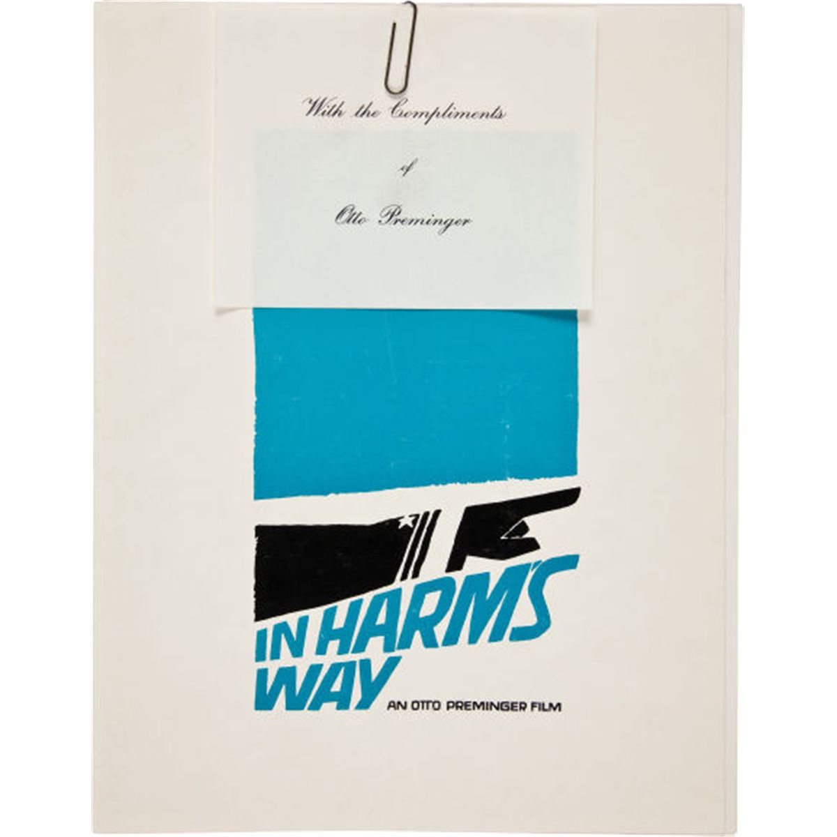 A Script from "In Harm's Way." Paramount, 1965. White (with graphics) covers, not dated, with printed note paperclipped to cover reading "With the Compliments / of / Otto Preminger," 241 pages, with numerous colored script change pages inserted in back of script, was Wayne's file copy.11" x 8 1/2"