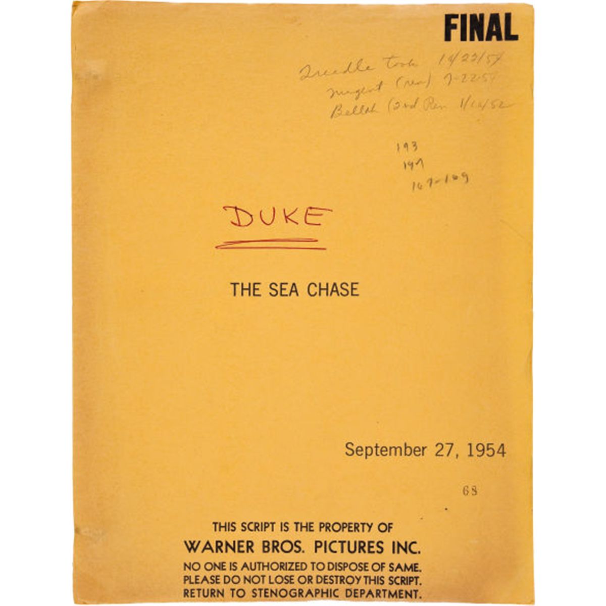 A Script from "The Sea Chase." Warner Bros., 1955. Goldenrod covers, screen play by John Twist, handwritten ownership signature in red ink on top center of cover reads "Duke," dated "September 27, 1954," marked "Final," 106 pages, was Wayne's file copy.11" x 8 1/2"