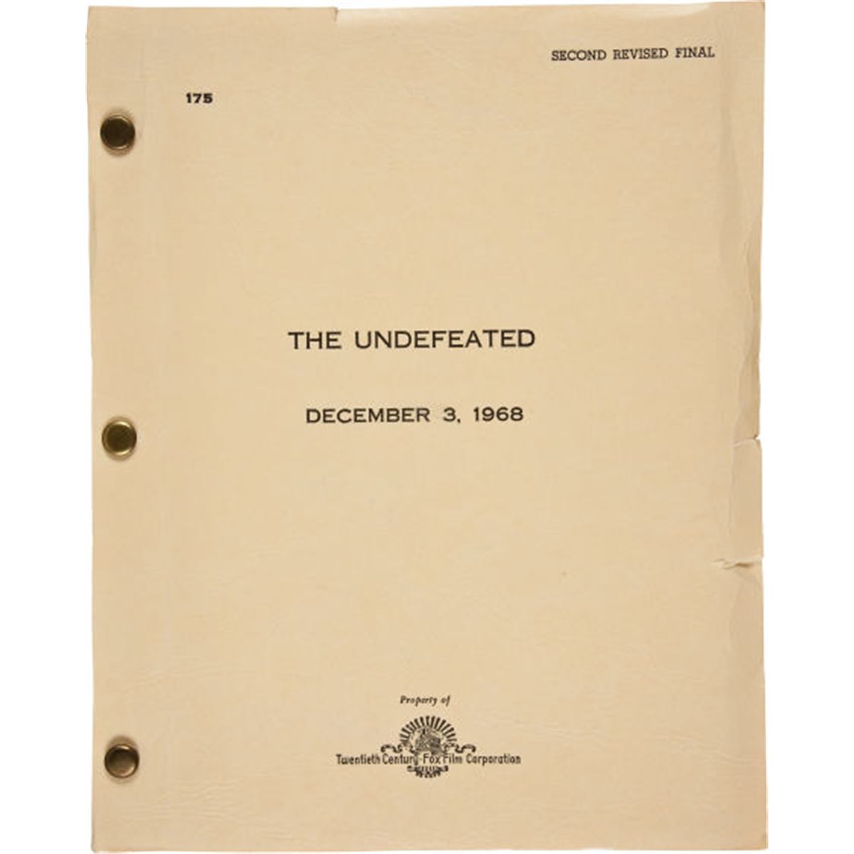 A Script from "The Undefeated." 20th Century Fox, 1969. Pale yellow covers, screen play by James Lee Barrett, dated "December 3, 1968," marked "Second Revised Final," 165 pages, with numerous colored script change pages throughout, was Wayne's file copy. (Please note covers are somewhat frayed.)11 1/2" x 9"