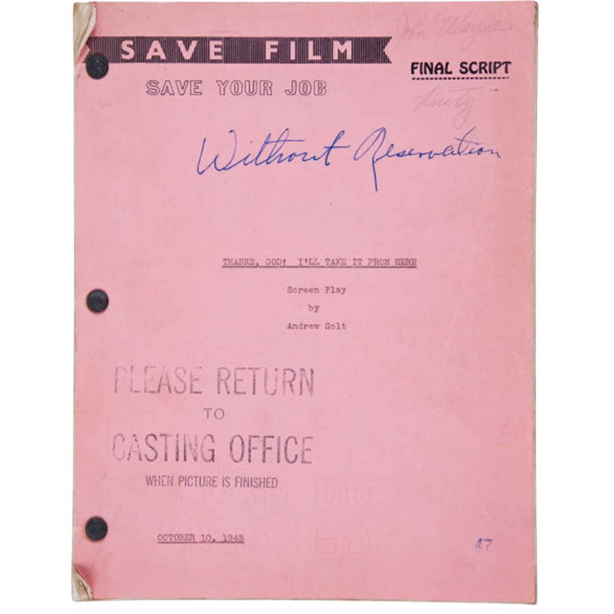 A Script from "Without Reservations." RKO, 1946. Pink covers, screen play by Andrew Solt, annotation in pencil by unknown hand on upper right corner reads "John Wayne / Rusty," noting working title of "Thanks, God! I'll Take It From Here," dated "October 10, 1945," 138 pages, was Wayne's file copy. (Please note covers are stained.)11" x 8 1/2"