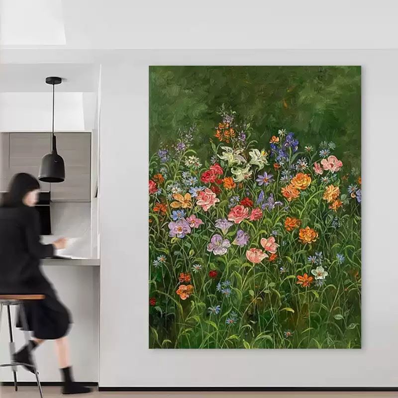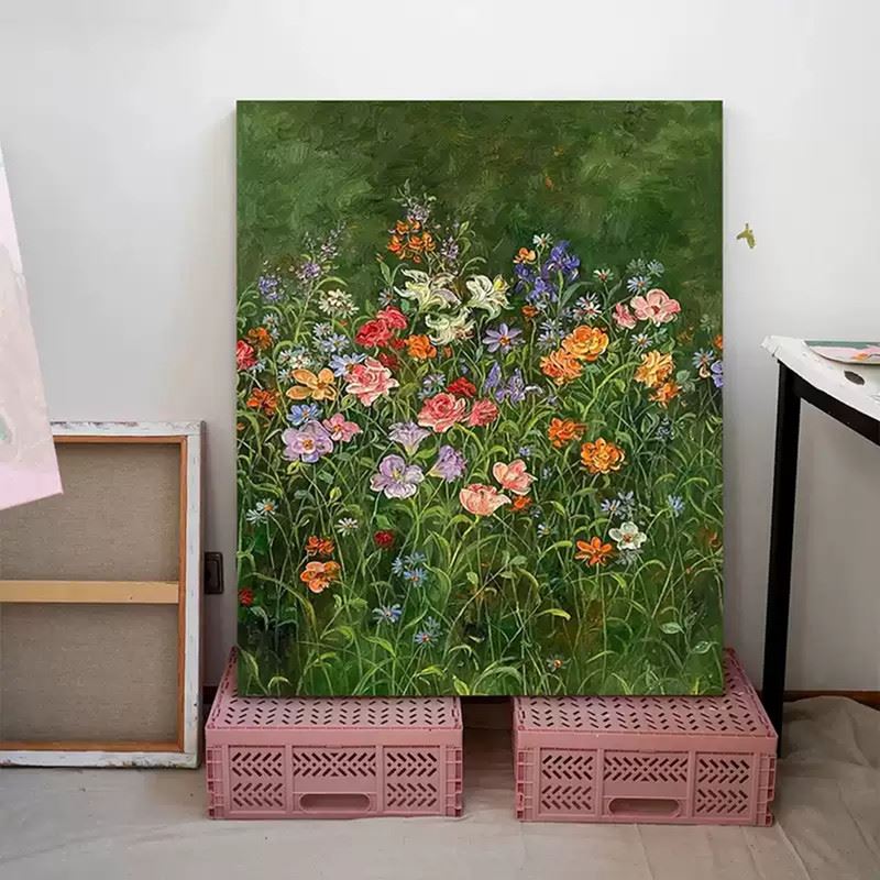 This artwork uses vibrant flowers and layered colors to showcase the vitality and abundance of nature. The colorful blossoms flow like waves, resembling a sea of flowers, evoking a sense of joy and boundless vitality. Dimensions: 24 x 31 inches.