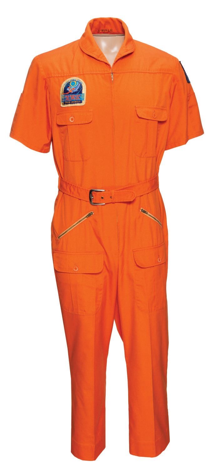 (EPCOT, 1980s) A rare Seabase Alpha costume for Attractions Hosts of The Living Seas in EPCOT Center. The bright orange one-piece costume features an embroidered attraction logo patch. Measuring a Men's Small, the costume is in very good park-used condition with expected wear to textile from handling and age.