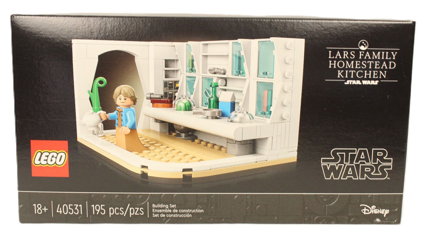 This is a retired lego set that has never been opened. The box is in excellent condition. It is a 195 piece lego set of the Lars Family Homestead Kitchen. The set includes1 Aunt Beru minifig.
