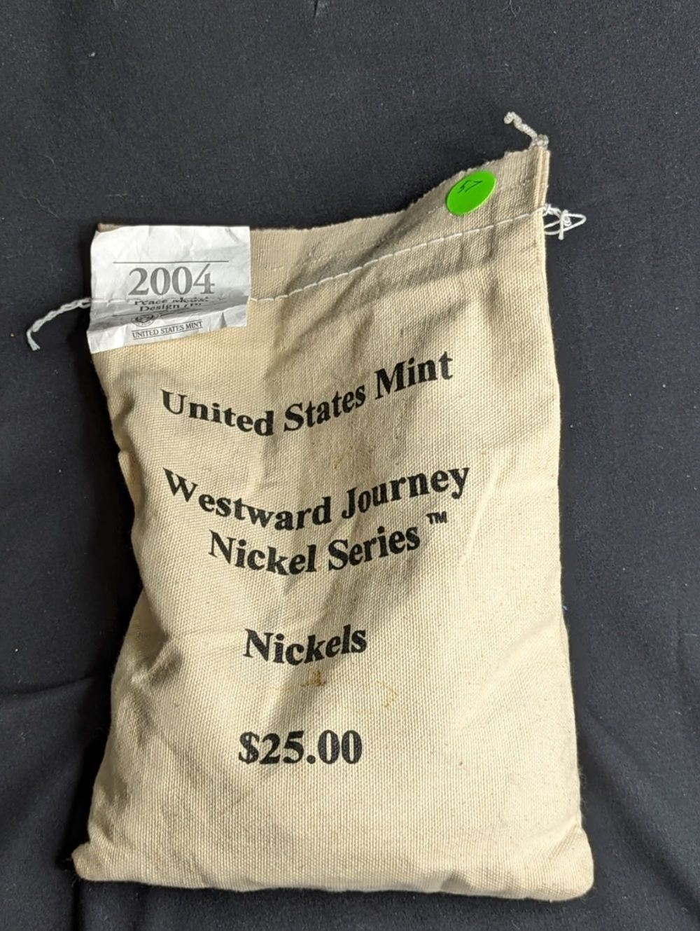 A Sealed US Mint Bag of 2004 (P) Jefferson Nickels $25 face value. This is a Sealed bag of unsearched Jefferson Peace nickels. Find your double die issue!