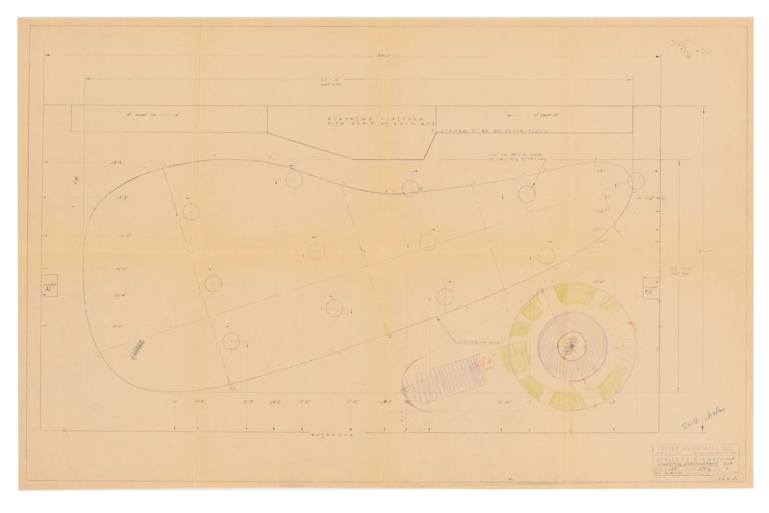 (Harper Goff, 1960) A Harper Goff architectural brownline for a lighting arrangement at the Seattle World's Fair. With the original date of 8.8.60, this piece has additional hand notations and a date inscription that reads "Rec'd 11/14/60." Measuring 21.75" x 34", this piece displays in very good condition with normal light wear from age and four original folds.