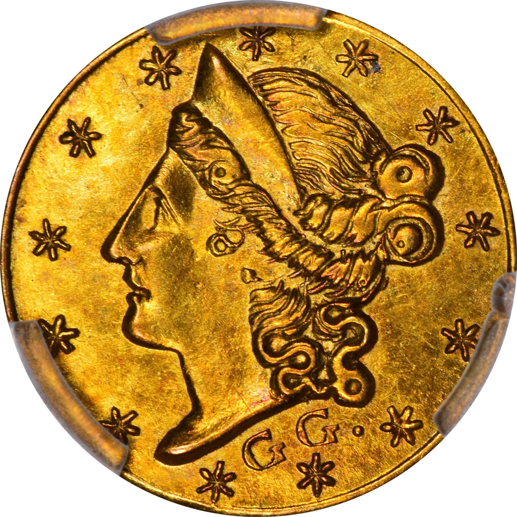 Description: 1853 G G. round ¼ Dollar, BG-218, PCGS MS62. Rarity 7. Obverse of BG-217, date off center to right (3 below A). 10 recorded specimens in Breen-Gillio 2003; 11 in Pop Report now, perhaps including duplication. Pristine surfaces, light even toning. PCGS AU58 William C. O’Connor (PCGS# 10403). PCGS POP 6 + 0.