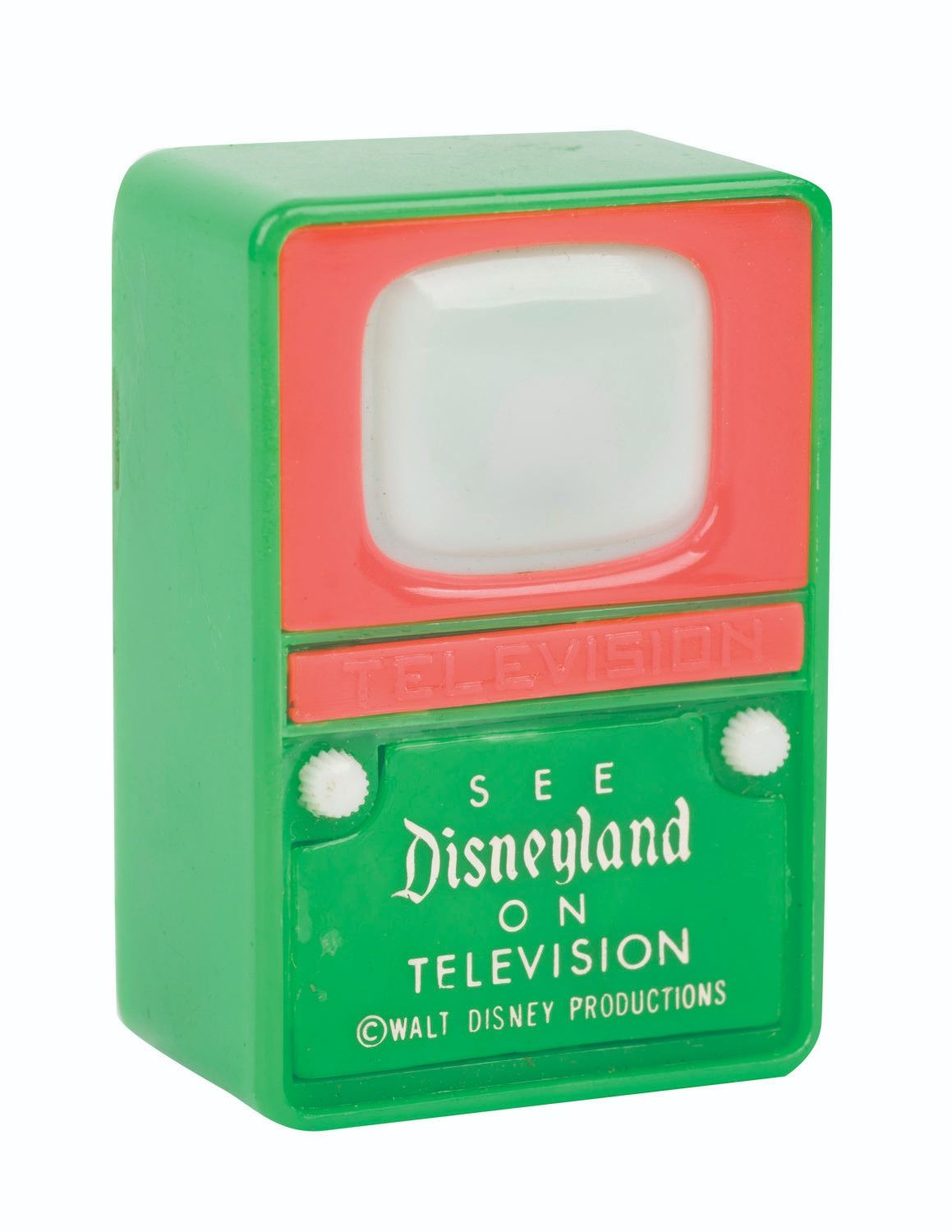 (Disneyland, 1955-58) An early "See Disneyland on Television" souvenir viewer toy with a scene of a Horse-Drawn Streetcar on Main Street, U.S.A. Designed to switch between different images, the viewer no longer functions. Measuring 2.25” x 1.5” x 1”, the toy displays in very good condition.