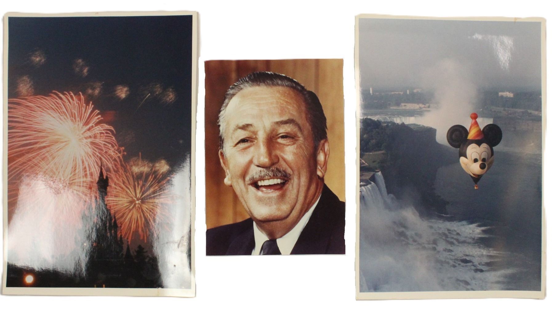 (The Walt Disney Company, 1991 - 1992) Included in this set is a headshot of Walt Disney presenting his classic smile, a picture of a Mickey Mouse shaped hot air balloon over Niagra Falls, and a picture of the Sleeping Beauty Castle in Disneyland Paris with fireworks in the background. The walt picture is ~ 5" x 7" and the others are ~ 7" x 10". The pictures are in very good condition.