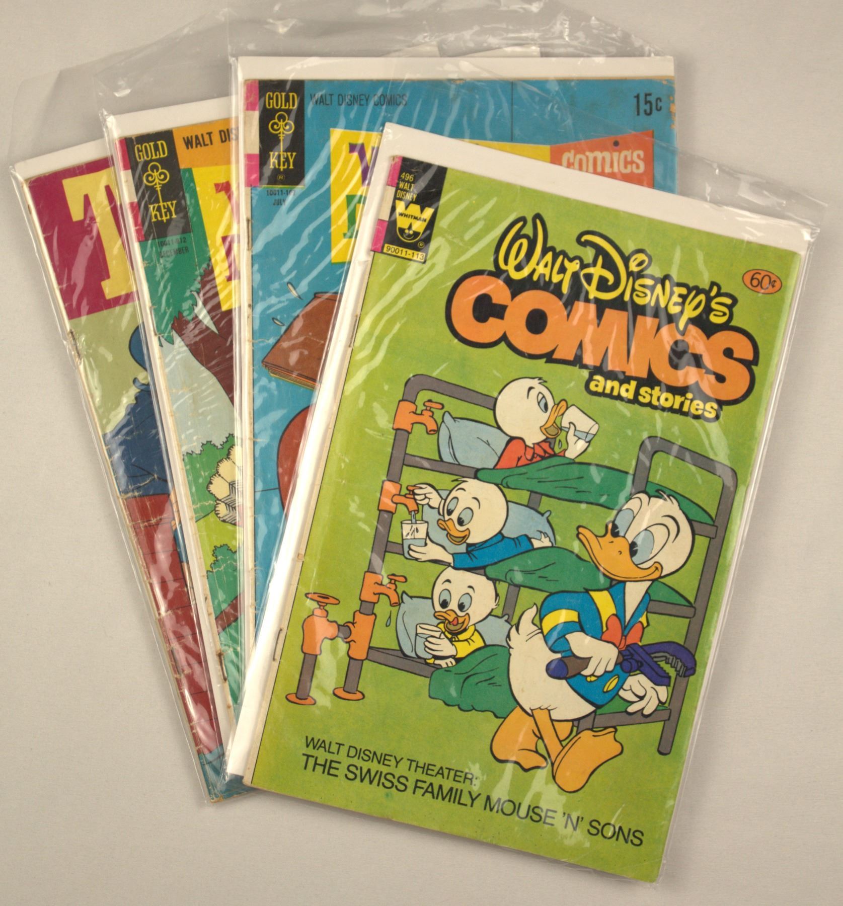 (Disney, 1967 - 1982) This is a selection of 4 Disney Comics. One is Walt Disney Mickey Mouse by Top Comics. Three are Walt Disney's Comics and Stories published by Gold Key and Whitman. All are in good condition with the exception of the July Gold Key which has some image missing in the bottom right corner.