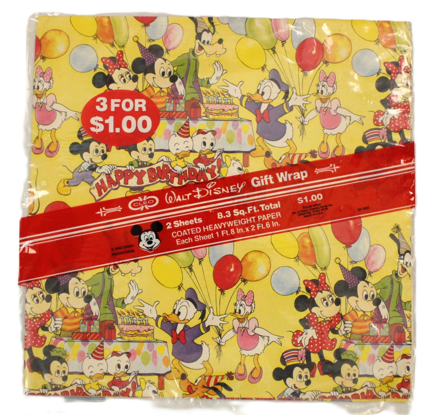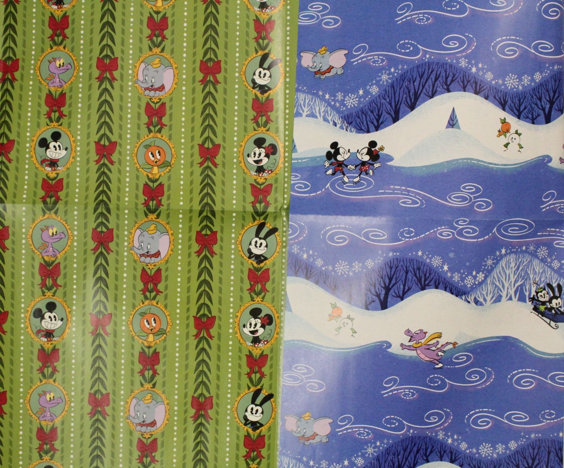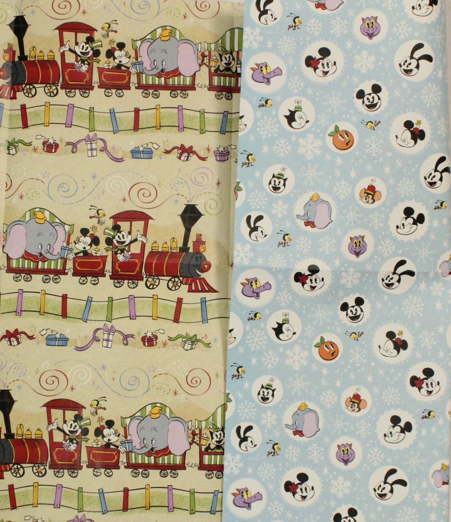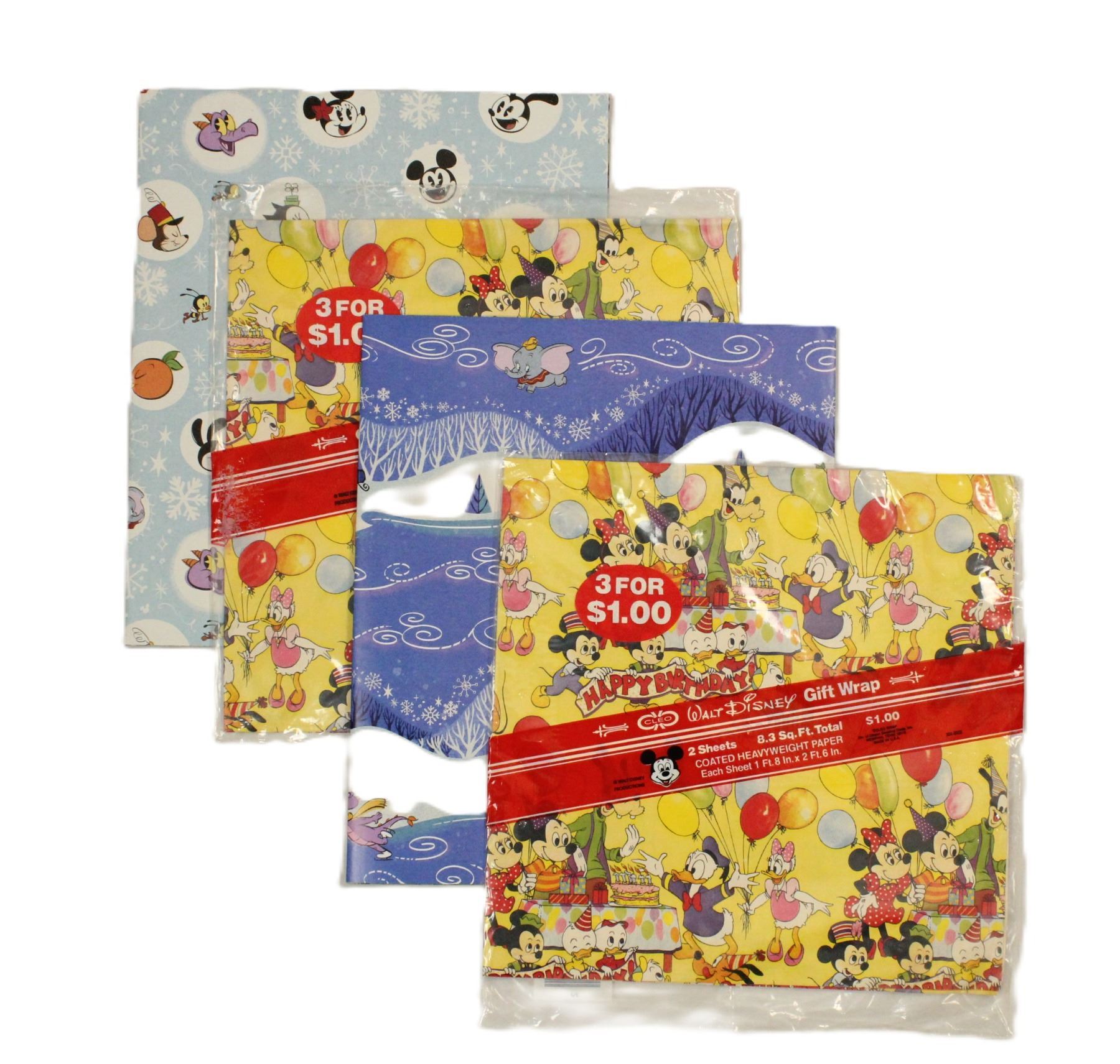 (Disney, 1980s, 2020s) Two packages of vintage Walt Disney World birthday wrapping paper. Each package contains two sheets measuring 1'8"x2'6". The modern holiday gift wrap is two double-sided sheets and measures 3'1"x3'8" each. They are in new condition.