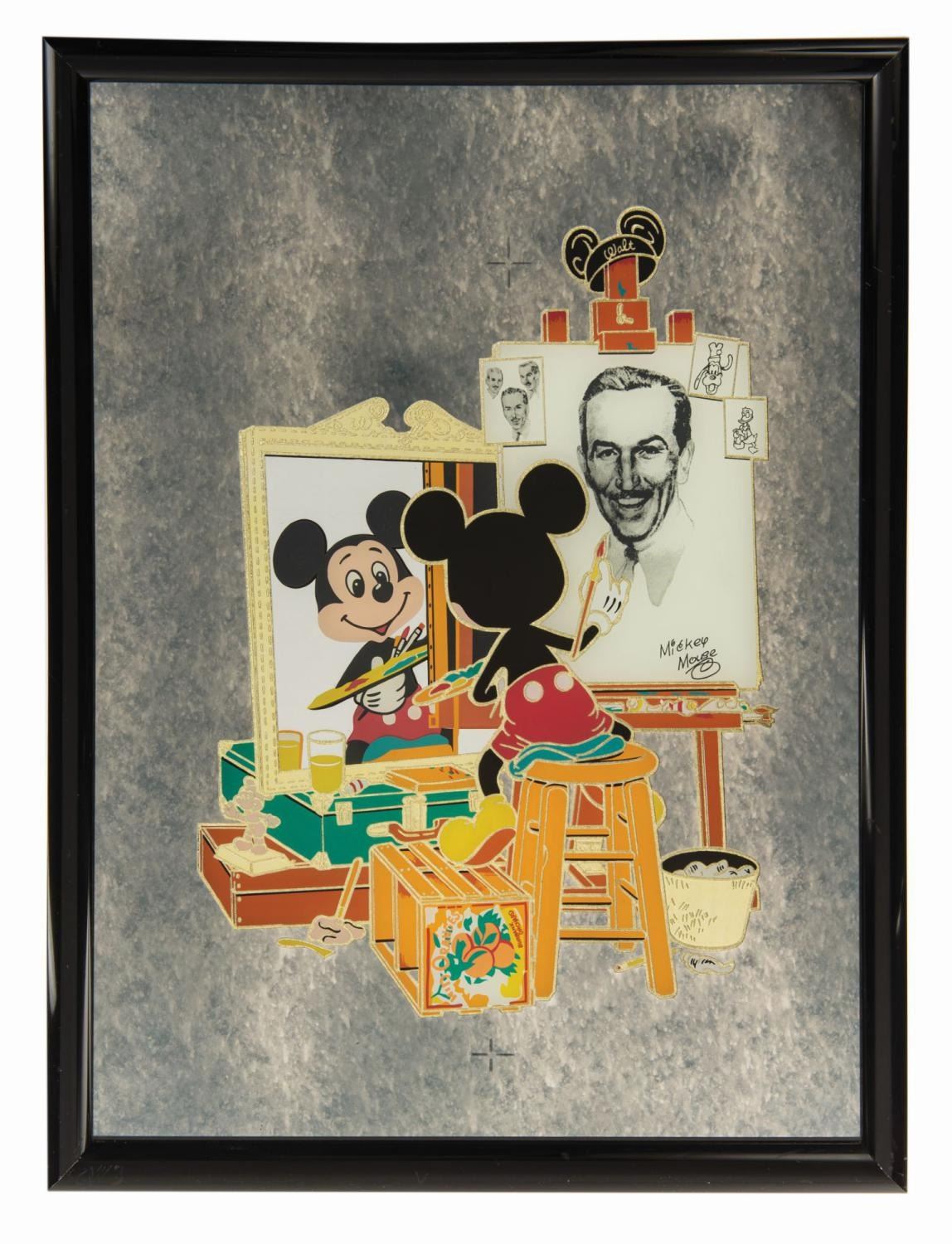 (Disneyland, 1980s-1990s) A framed “Self Portrait: Mickey Mouse” by Charles Boyer printed on a glass, mirrored background. Based on Boyer’s 1989 painting of Mickey and Walt, this edition features gold accents and real mirrored elements. Measuring 19.5” x 25.5” the framed piece is in good condition, with a few scuffs and minor wear to the frame.
