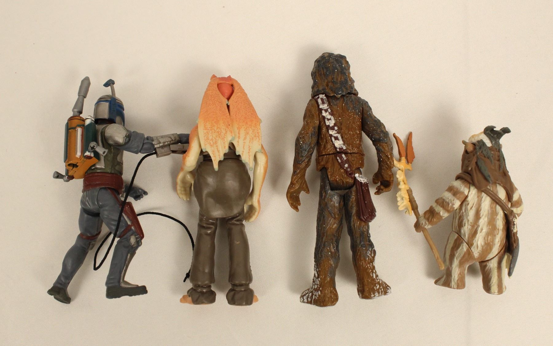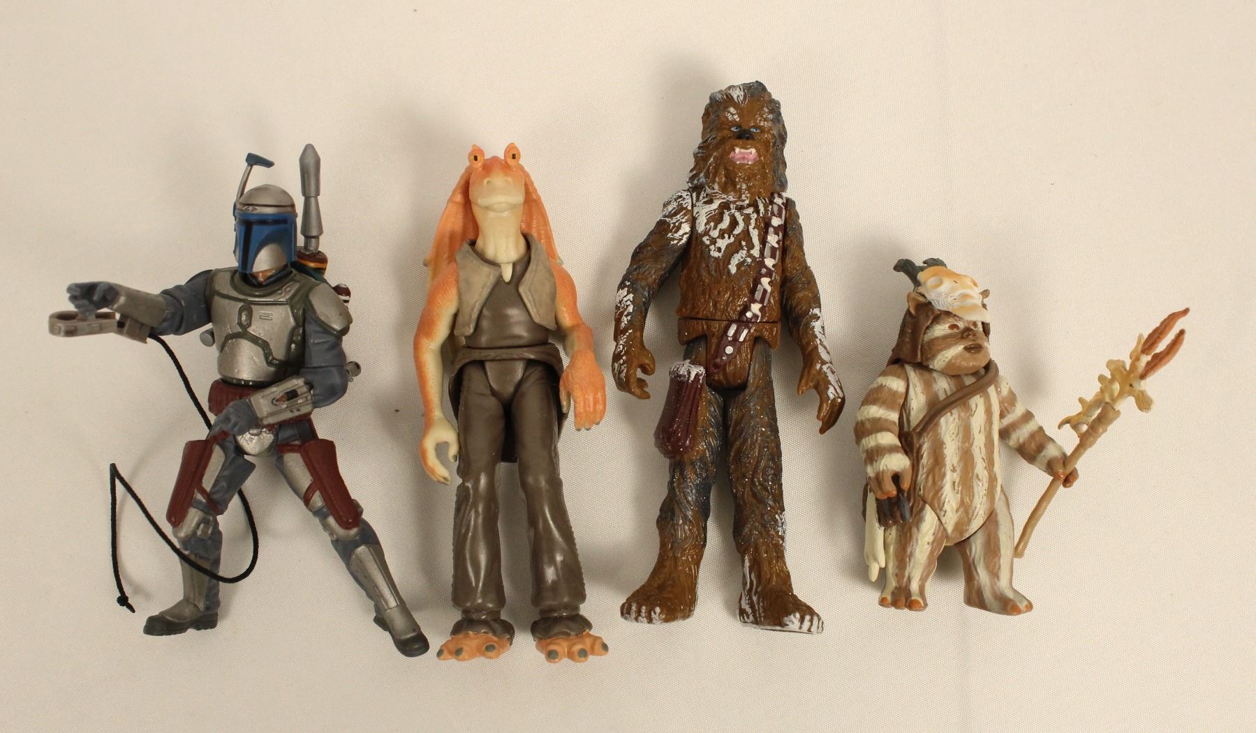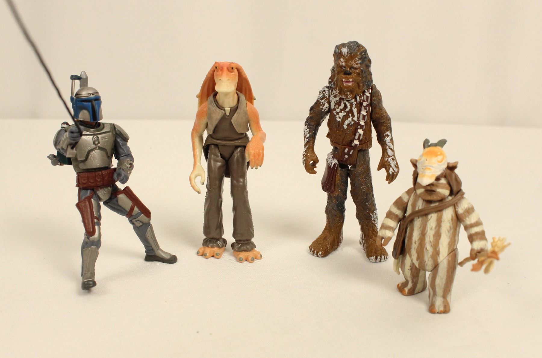 (Kenner:Hasbro, 1998:2001) This two 1998 and two 2001 Star Wars action figures with some accessories. Includes Logray (98), Chewbacca (98), Jango Fett (01) and Jar Jar Binks (01). They are in excellent condition.