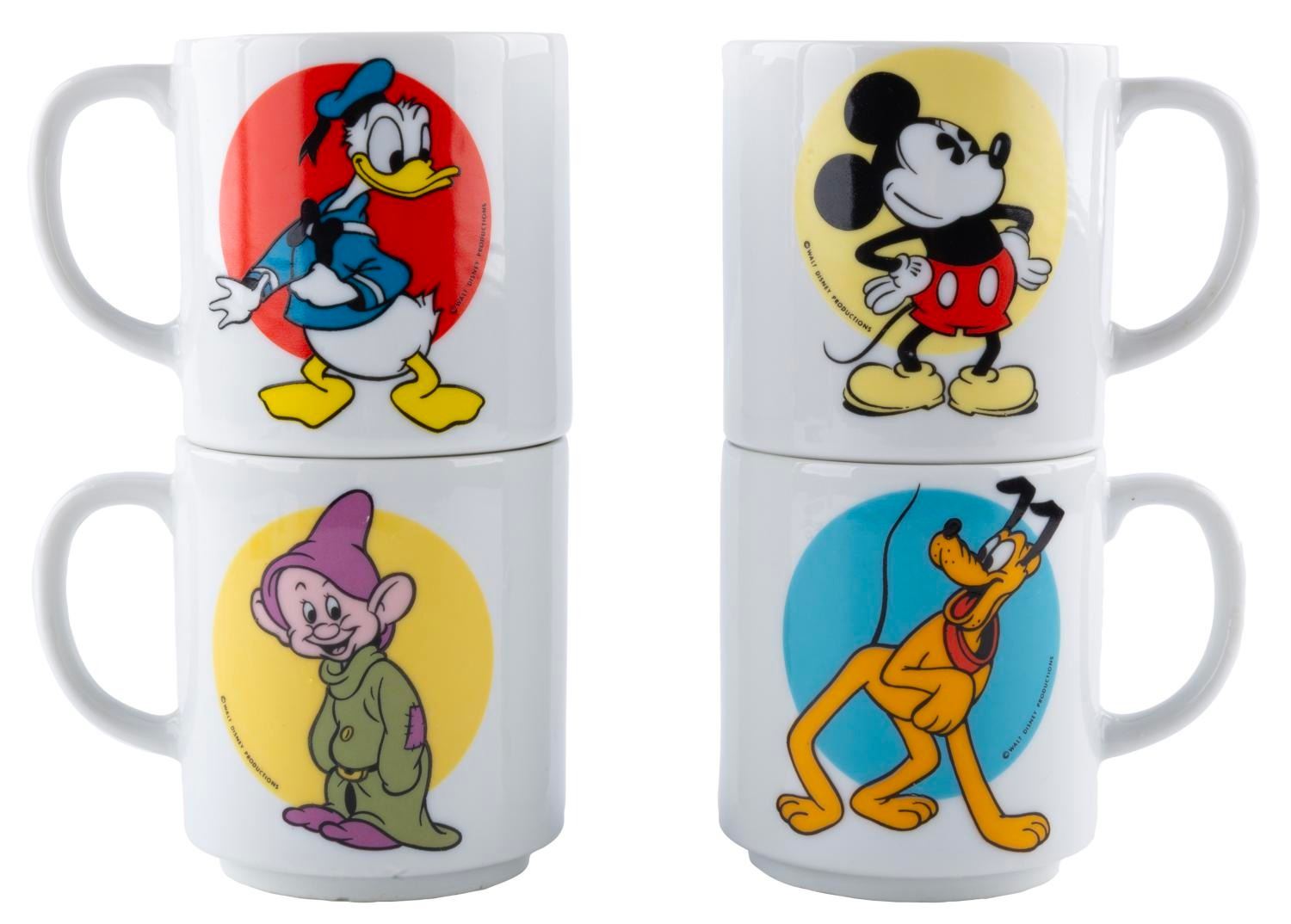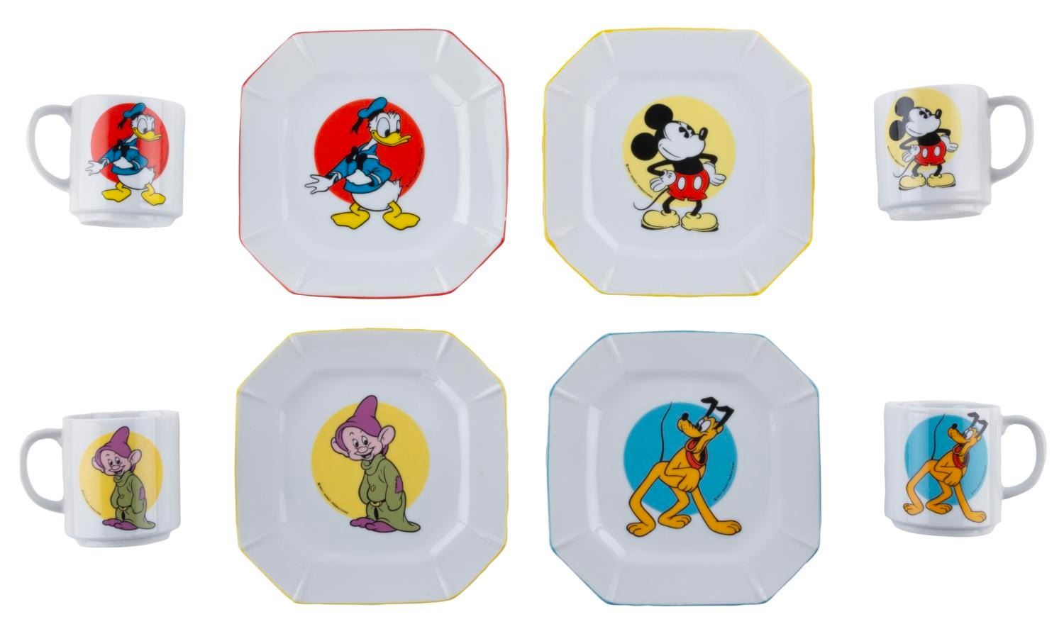 (Disneyland, 1970s) A set of four plates and four coffee mugs featuring Donald Duck, Pluto, Dopey, and pie-eyed Mickey Mouse. Measuring between 3" and 7.5" in diameter and 3.25" tall, the dishware is in very good condition with slight paint loss, a small chip to the bottom edge of the Pluto mug, a small mark to the Mickey mug, and light scuffing to the plates.