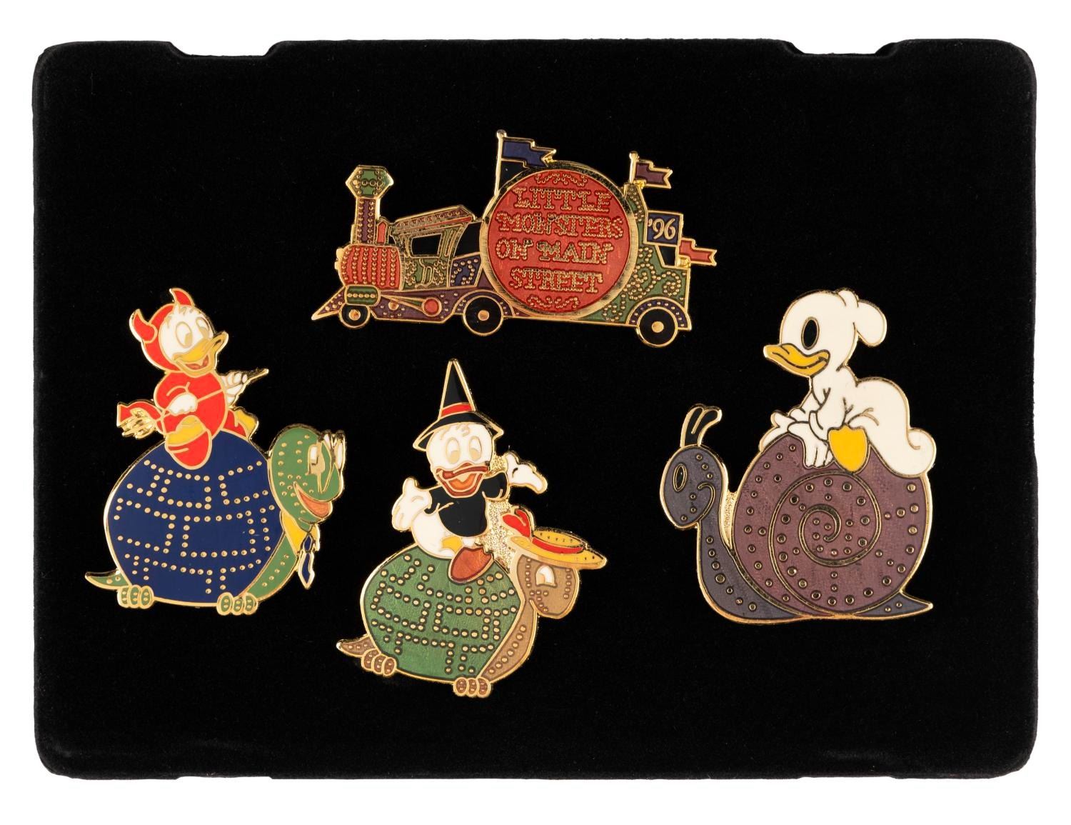 (Disneyland, 1996) A Cast Exclusive set of four Little Monsters on Main Street pins featuring Huey, Dewey, and Louie dressed up and riding Main Street Electrical Parade floats. The pins were released in a limited edition of 300. With their case measuring 3" x 4", the pins are in fine condition with light handling wear to the case.