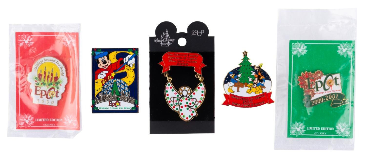 (Walt Disney World, 2000-2002) A collection of five holiday events at Walt Disney World and Epcot. Included are two Spectacle of Lights pins from 2000, and three Epcot Holidays Around the World pins from 2000 and 2001. The pins display in very good to fine condition. The Mickey and Friends Spectacle of Lights pin has a light-up feature that is no longer functional.