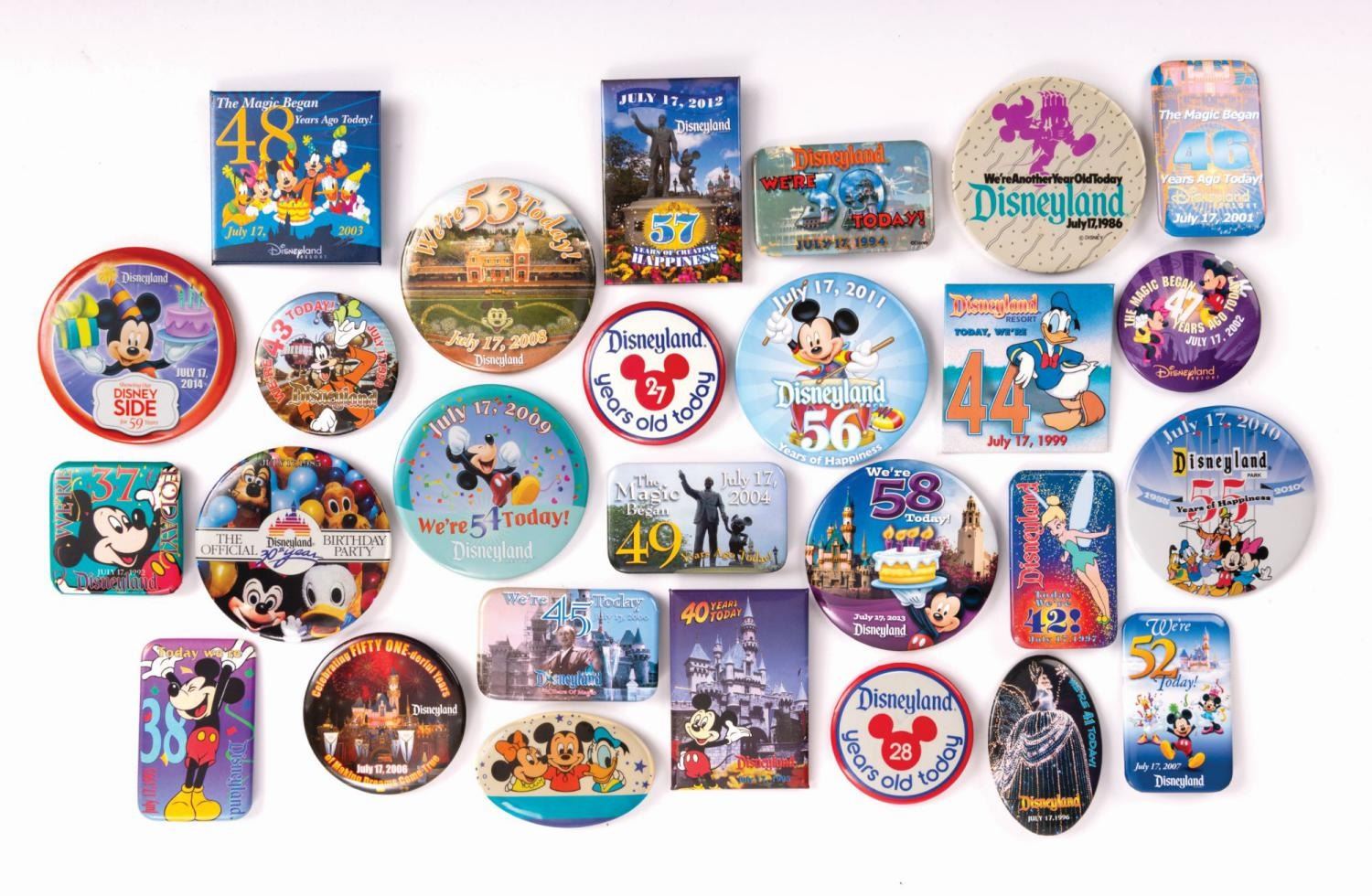 (Disneyland, 1982-2014) A set of (27) pin-back buttons issued to Cast Members in honor of the anniversary of the Grand Opening of Disneyland. Every year, near July 17th, special anniversary buttons are distributed exclusively to wear on their wardrobe. This set of buttons include the following anniversaries: 27, 28, 30, 31, 37-49, and 51-59. The set is accompanied by an unnumbered button depicting Minnie Mouse, Mickey Mouse, and Donald Duck wearing contemporary (for the 1980s) clothing. Ranging in size from 2.25" in diameter to 3" in diameter, the collection is in very good condition overall with some minor surface wear.