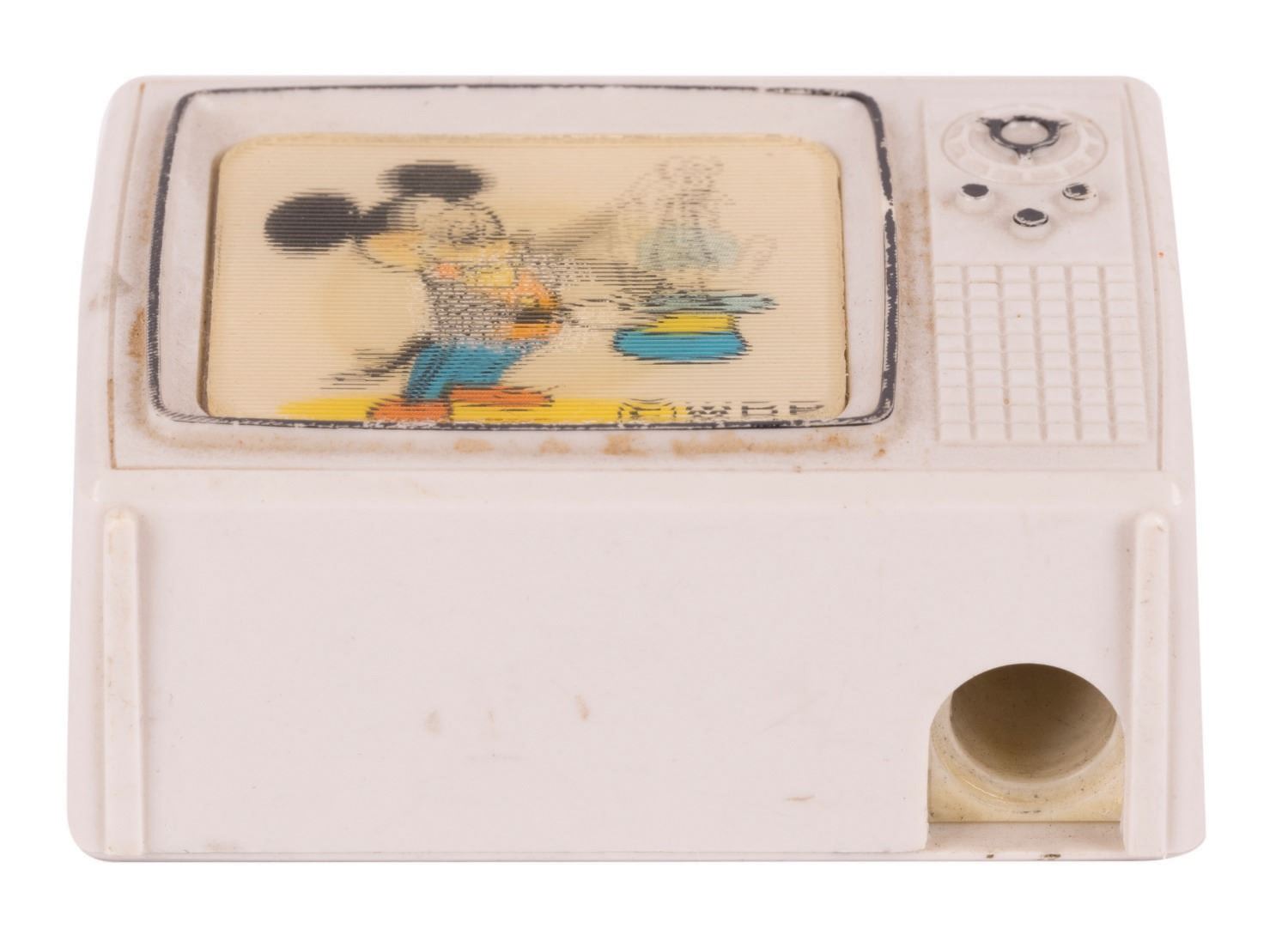 A Set of (3) Disney Wiggle TV Pencil Sharpeners. (Disney, 1960s) A set of (3) Disney Wiggle TV Pencil Sharpeners. Each pencil sharpener is in the character of a television set and features a lenticular image of Mickey Mouse or Hyacinth Hippo. Measuring 2.25"x1.75", each piece is in good condition with minor wear from handling and age.