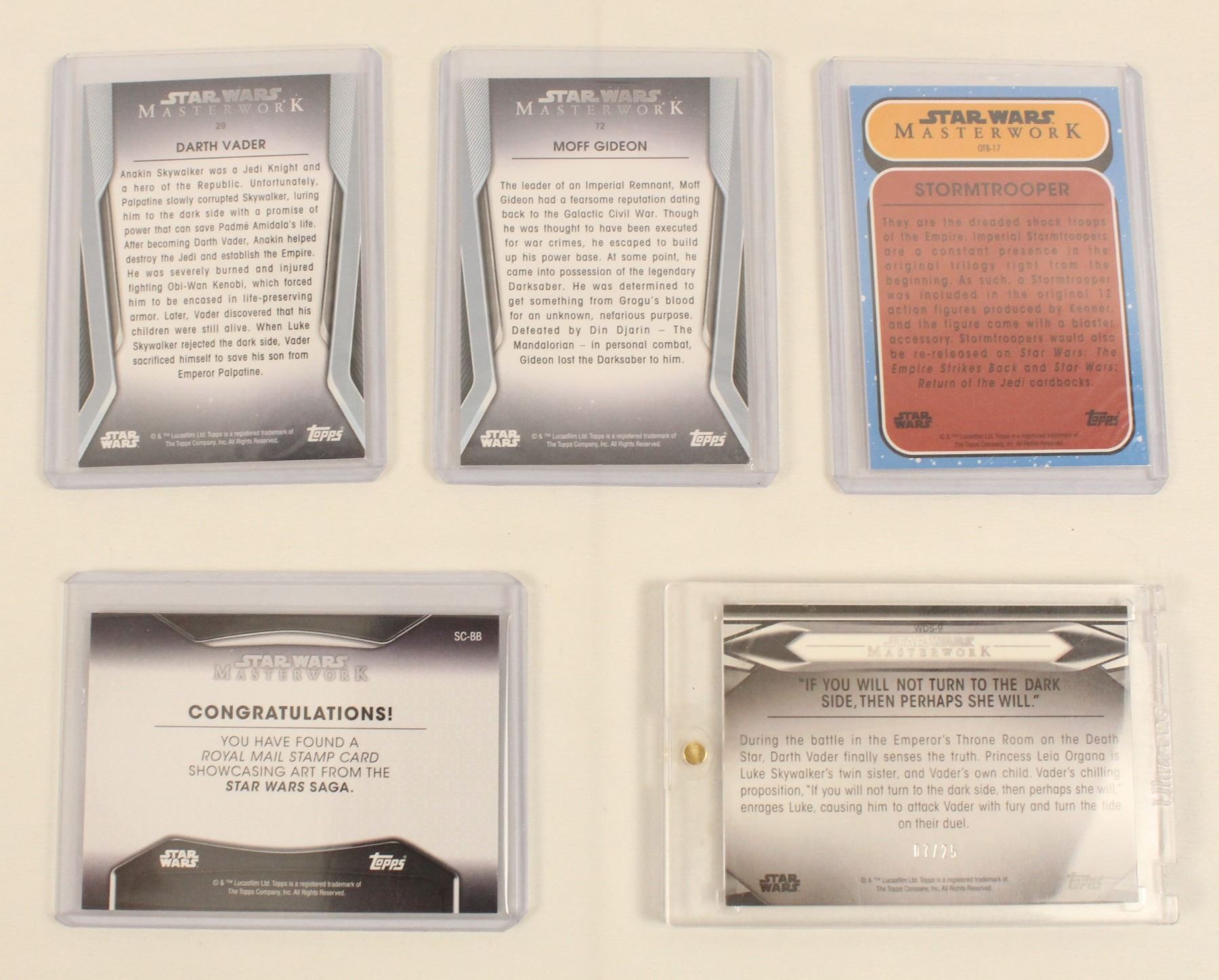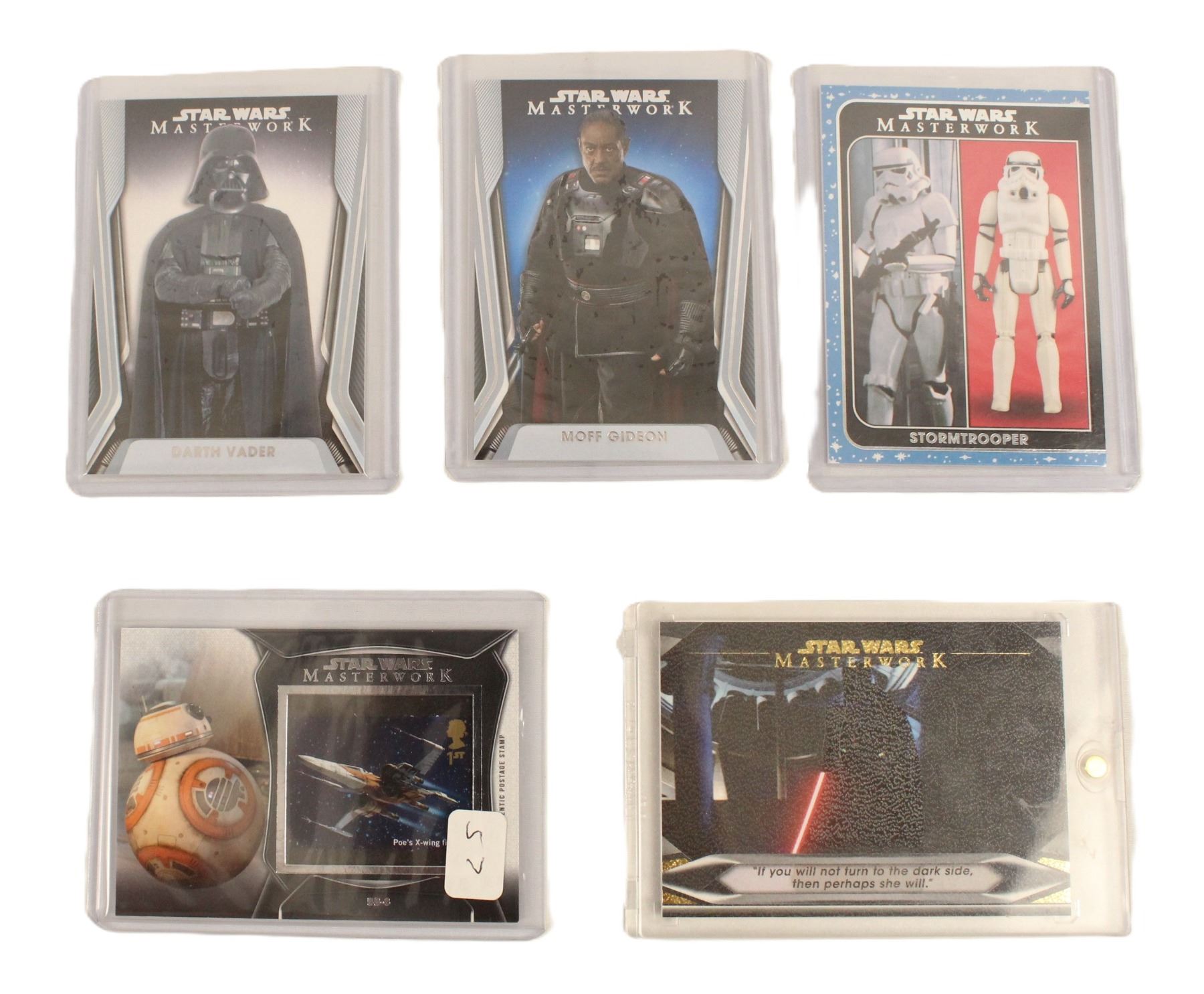 These are ungraded but mint condition Topps Star Wars Masterwork trading cards. Included are Storm Trooper 0TB-17 higlighting the live action and the action figure, BB-8 (SC-BB) Royal Mail Stamp Card featuring Poe Dameron's X-Wing, Moff Gideon #72 with the Dark Saber, Darth Vader #29, and a Canvas WDS-9 # 07/25 limited edition in an UltraPro locked hard case card protector. All other cards come in both a soft and hard plastic protector.