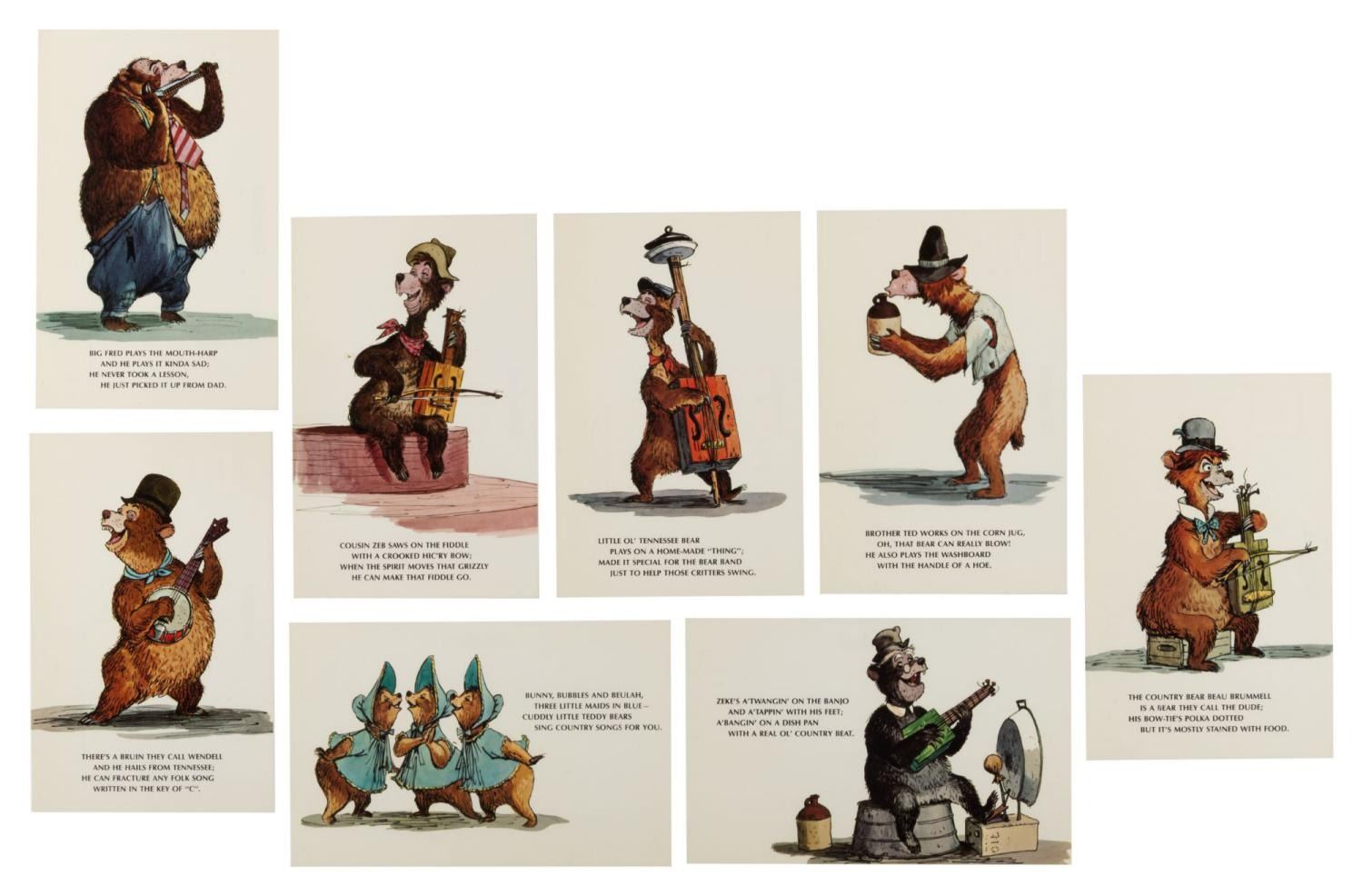 (Disneyland, 1972) An original set of eight Country Bear Jamboree concept art postcards featuring the designs of Imagineer Marc Davis. Each measuring 3.5" x 5.25", the postcards are in fine condition.