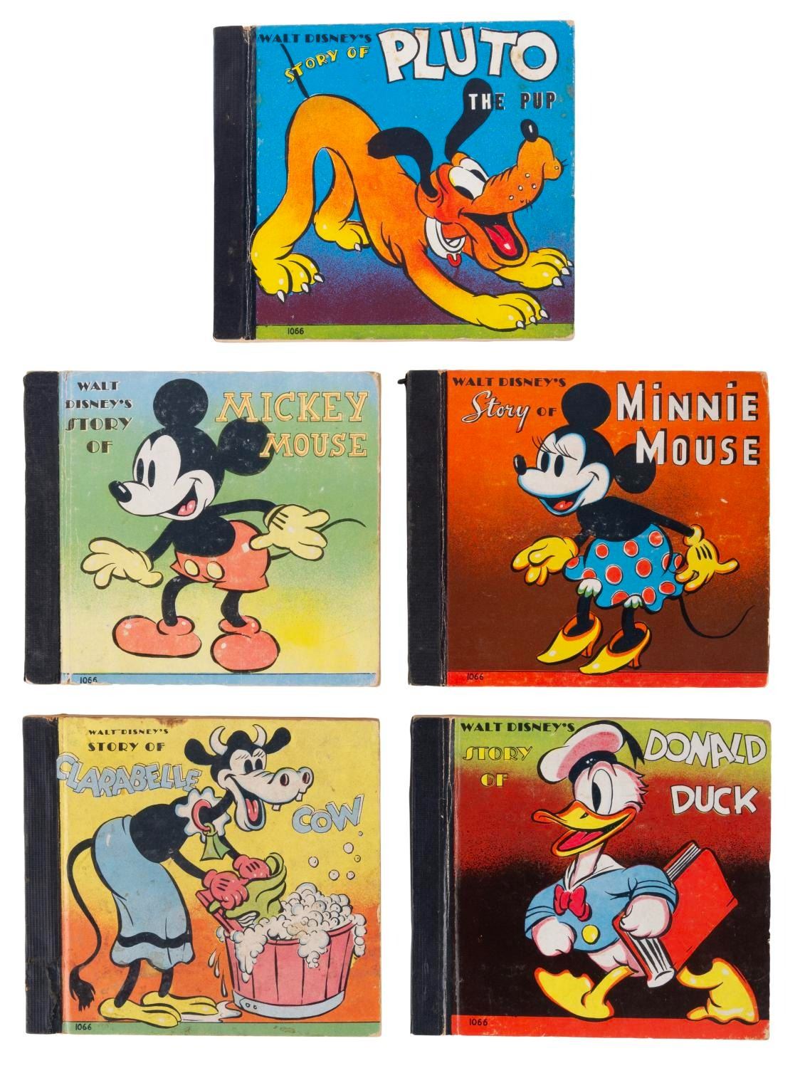 (Disney, 1938) A set of Disney character storybooks focusing on Mickey Mouse, Minnie Mouse, Donald Duck, Pluto, and Clarabelle Cow. Measuring 5" x 5.75", the books are in good condition with wear to the covers and edges and several inscriptions.