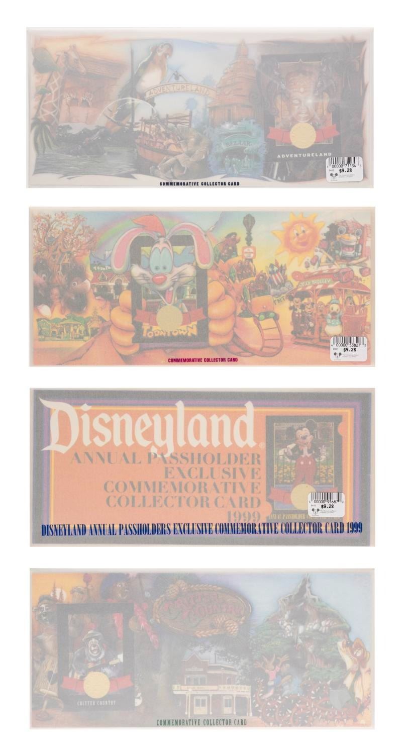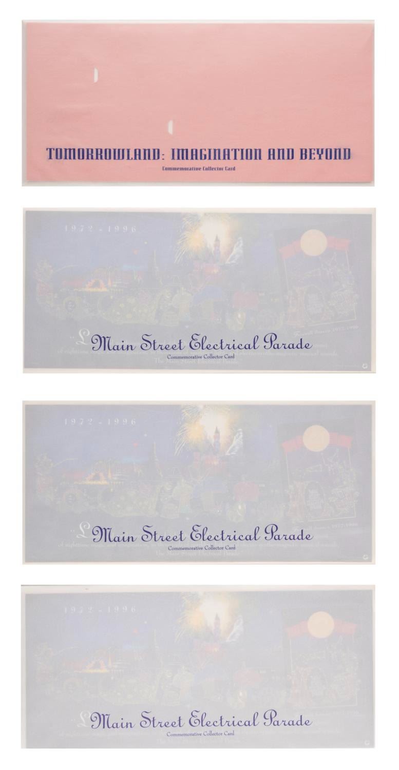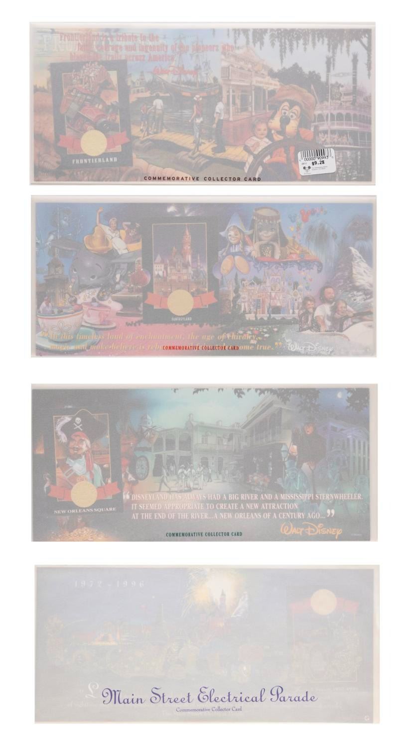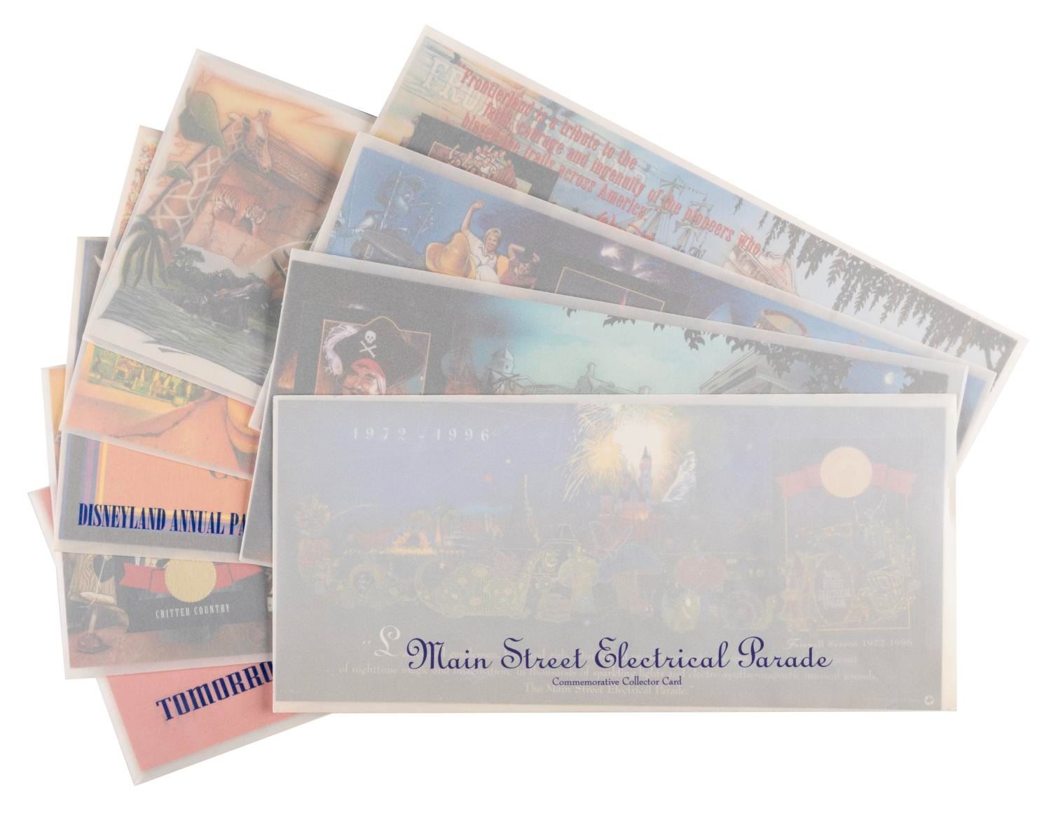(Disneyland, 2000s) A collection of 12 Disneyland cards with holders and envelopes. Each card focuses on a memorable land or attraction with three duplicates of the Main Street Electrical Parade. The cards measure 3.5"x2.5", the holders are 5"x11", and the envelopes are 5.25"x11.25", each piece in very good to fine condition with some wear.