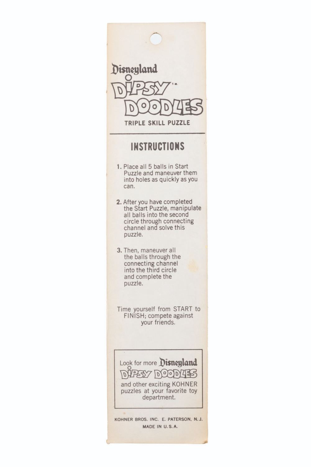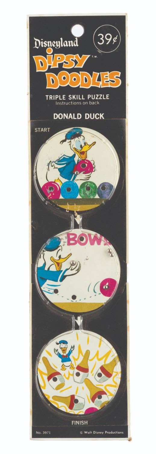 (Kohner Bros., 1950s-60s) A set of three unopened Disneyland Dipsy Doodle Donald Duck skill puzzles. Measuring 2.5" x 11" in the original packaging, the puzzles are in good condition with light soiling, partial separation of blister pack from backing, discoloration, and staining.