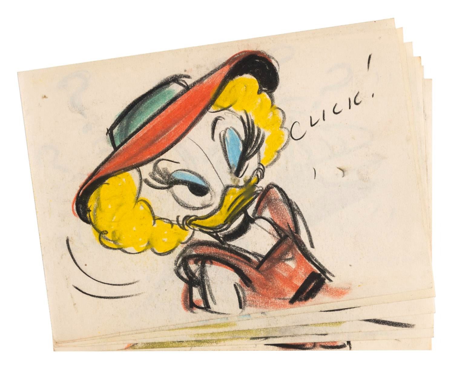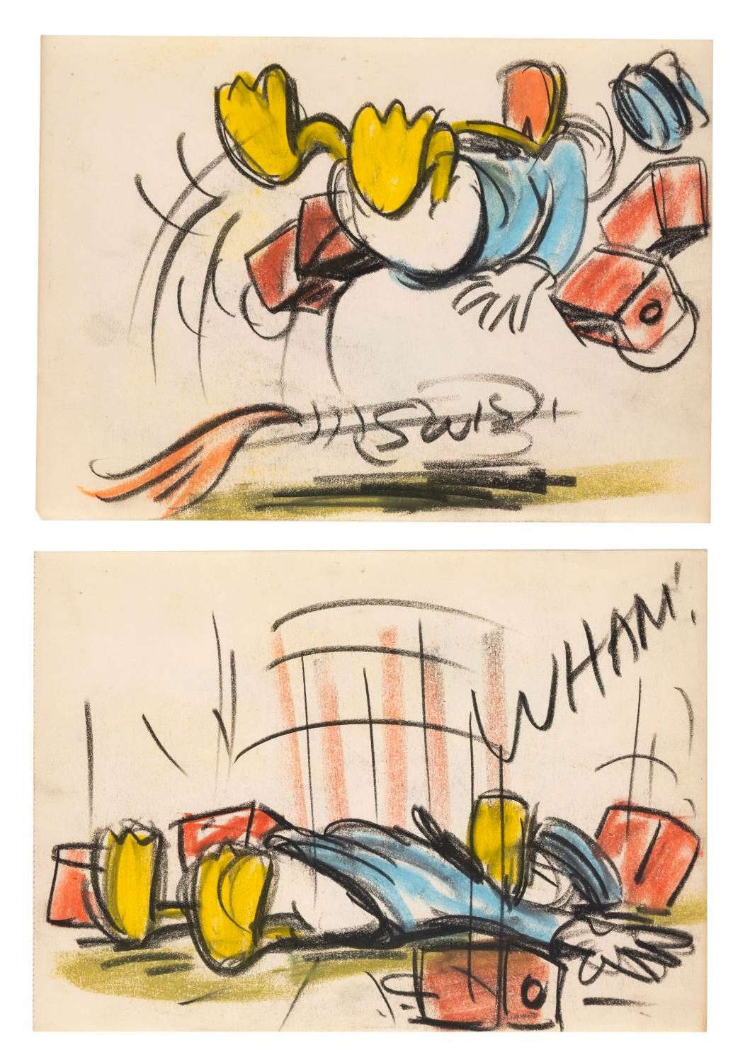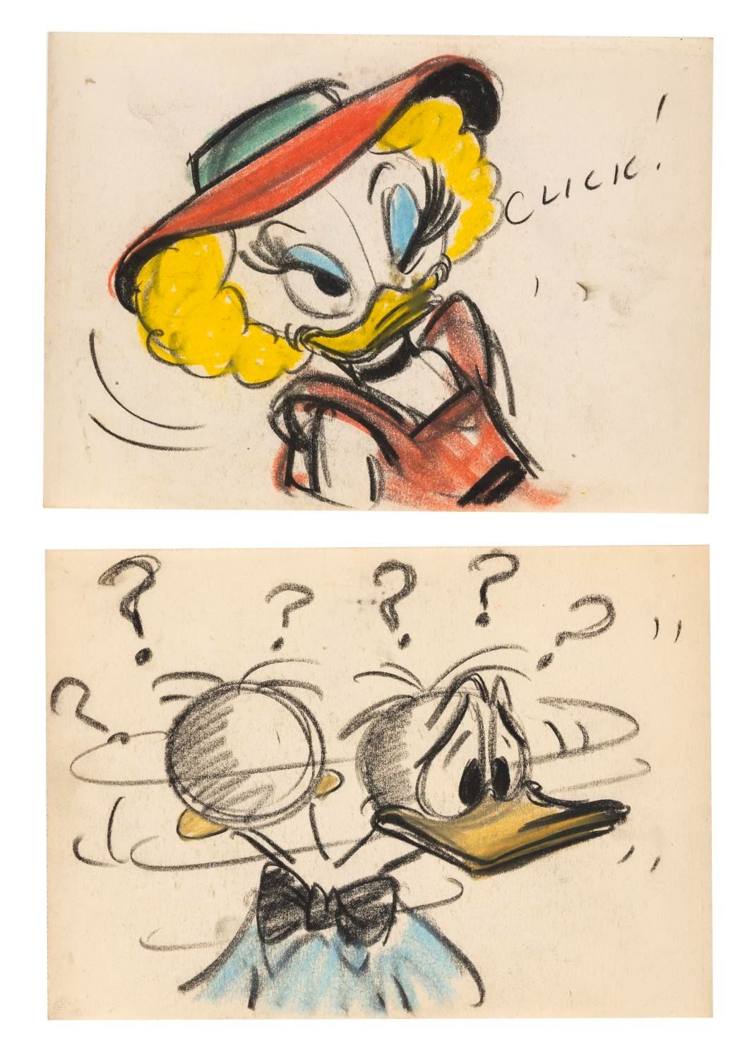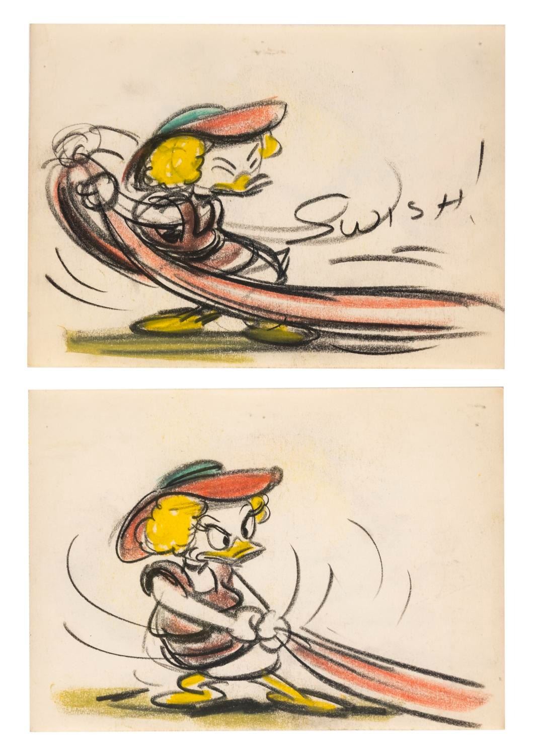 (Disney, 1951) A set of six storyboard panels for an unused gag from the Donald Duck short “Lucky Number.” In the cartoon one of the nephews briefly dresses as a femme fatale to trick Donald out of gasoline from his service station. Each measuring 6” x 8.25” and accomplished in grease pencils, the panels are in very good production-used condition.