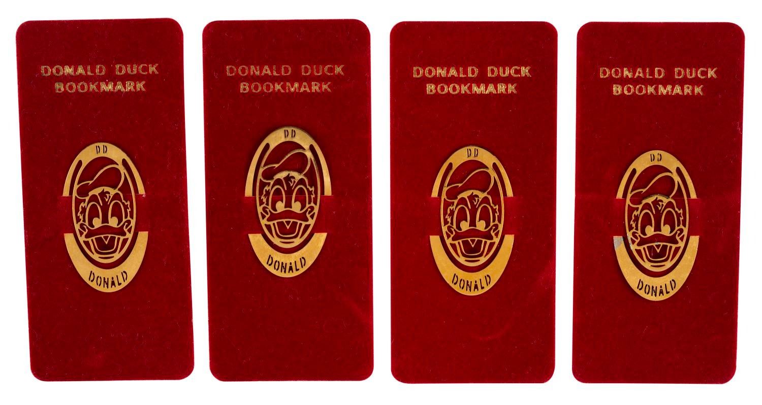 (Disney, 1980s-90s) Four metal Donald Duck bookmarks on their original cards. Each measuring 1.75” x 1”, the bookmarks are in very good condition with light handling wear.