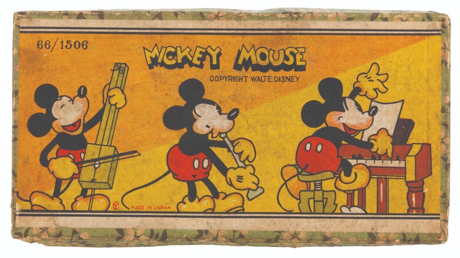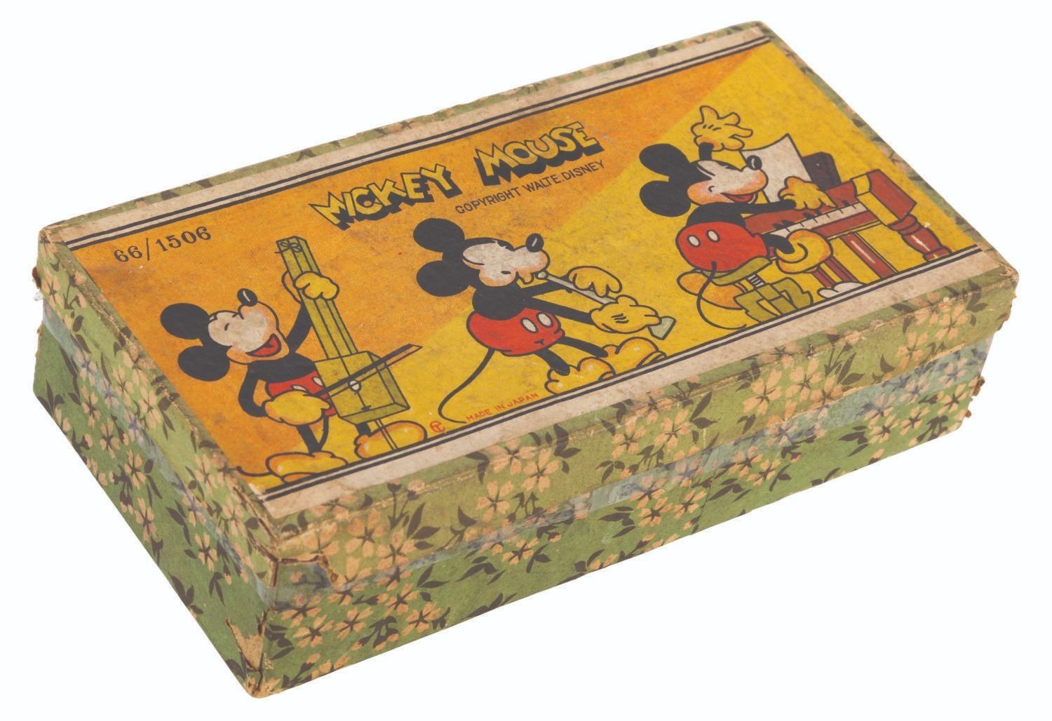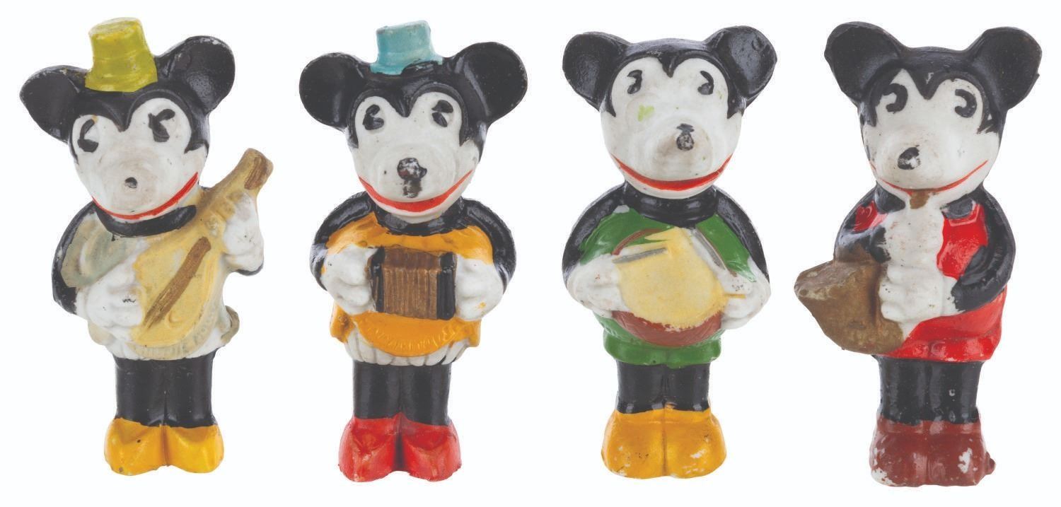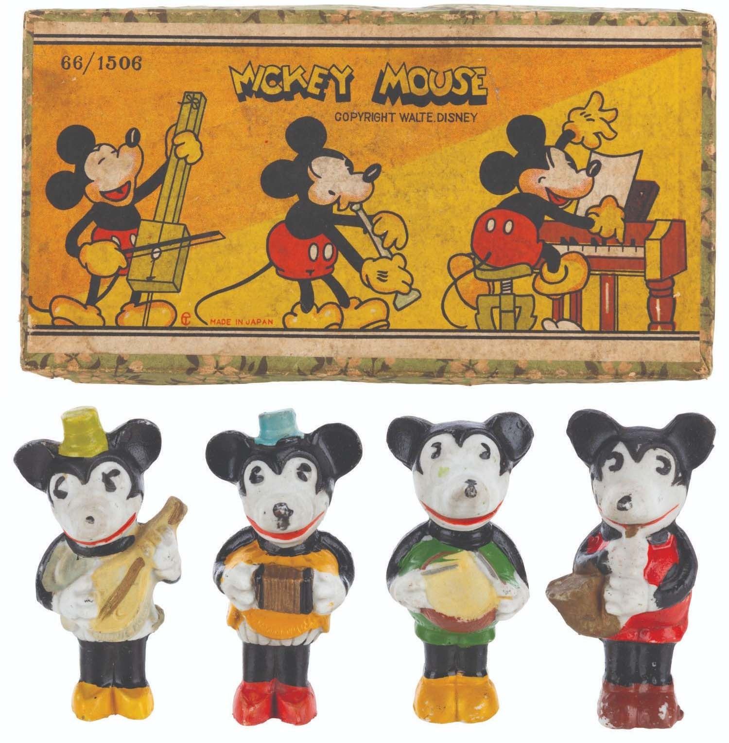 (George Borgfeldt & Co., 1930) A set of four Mickey and Minnie Bisque figurines by George Borgfeldt & Co. The company was the first to be granted the license to create toys of Mickey and Minnie in February of 1930 and released the figurines later that year, making them among the very first of the characters ever produced. Measuring 3.5” tall each, the figurines display in good condition with areas of light paint loss, scuffs, imperfections in the paint from manufacturing, and a chip behind the right arm on one of the Minnie figurines. The figurines are packaged in their original 7” x 3.5” x 1.75” box in fair condition with heavy wear, creasing, and tears.