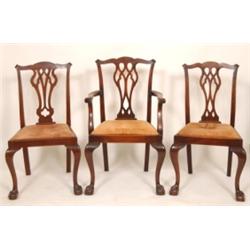 A Set of Eight George III Style Mahogany Dining Chairs, with serpentine crest rails, pierced vase shaped splats, drop in seats and cabriole front legs with claw and ball feet (7 + 1) See illustration £600 - 1000