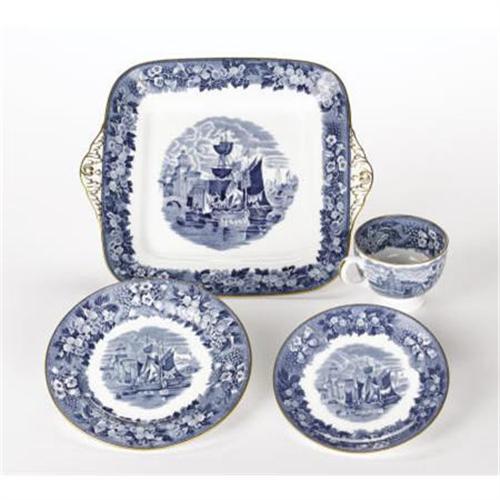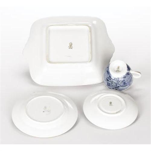 <B>A Set of English Porcelain Pieces<BR></B></I>Wedgwood<BR>Twentieth Century<BR>Comprising a square serving plate with double handles, a bread plate, and a cup and saucer, all decorated in blue and white with a harbour scene to the center, gilt rim<BR>Impressed mark to the underside<BR>The square plate: 9.2 inches high x 10.7 inches wide; the bread & butter plate: 6.7 inch diameter<BR><BR><b>Shipping:</b> Requires 3rd Party Shipping (<a target="_blank" href="http://www.heritageauctions.com/common/shipping.php">view shipping information</a>)