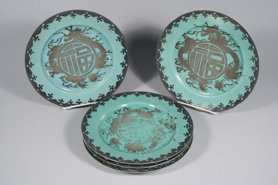 A Set of Five Japanese Porcelain and Silver Overlay Plates with Dragon Motif, Each Signed on Bottom.
