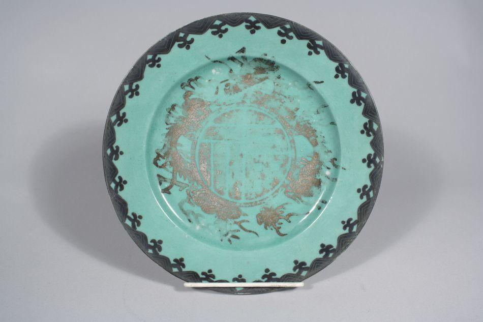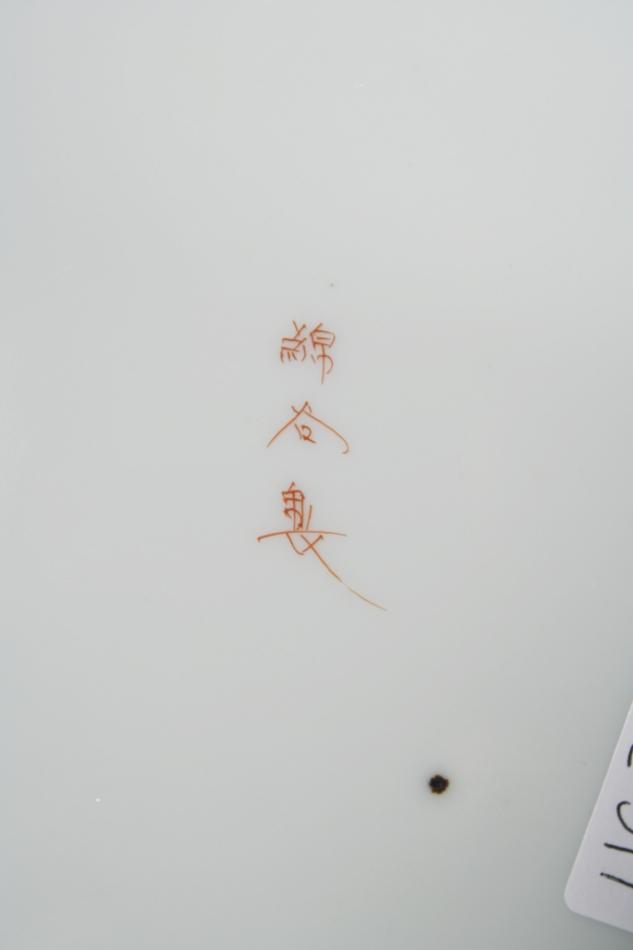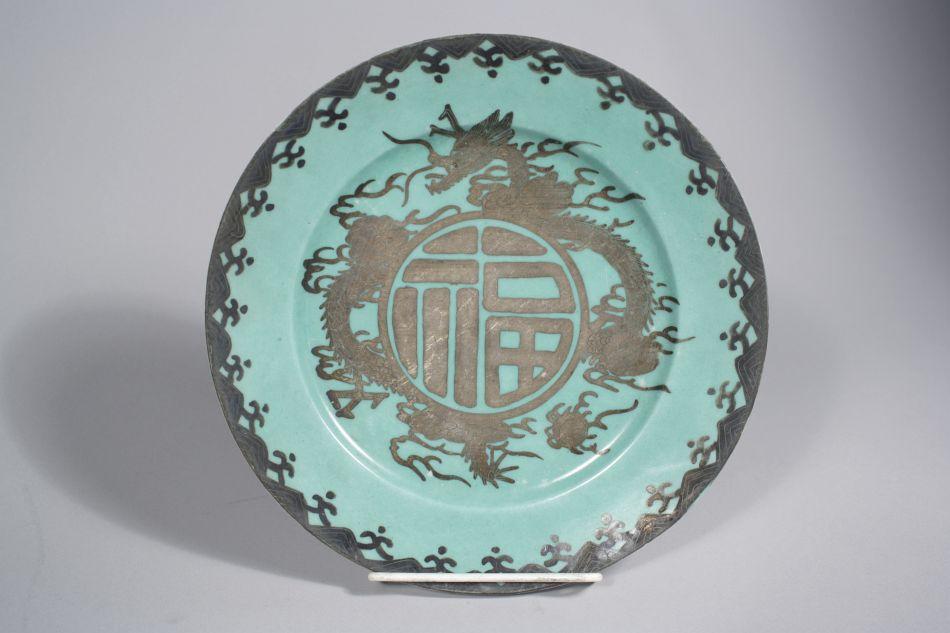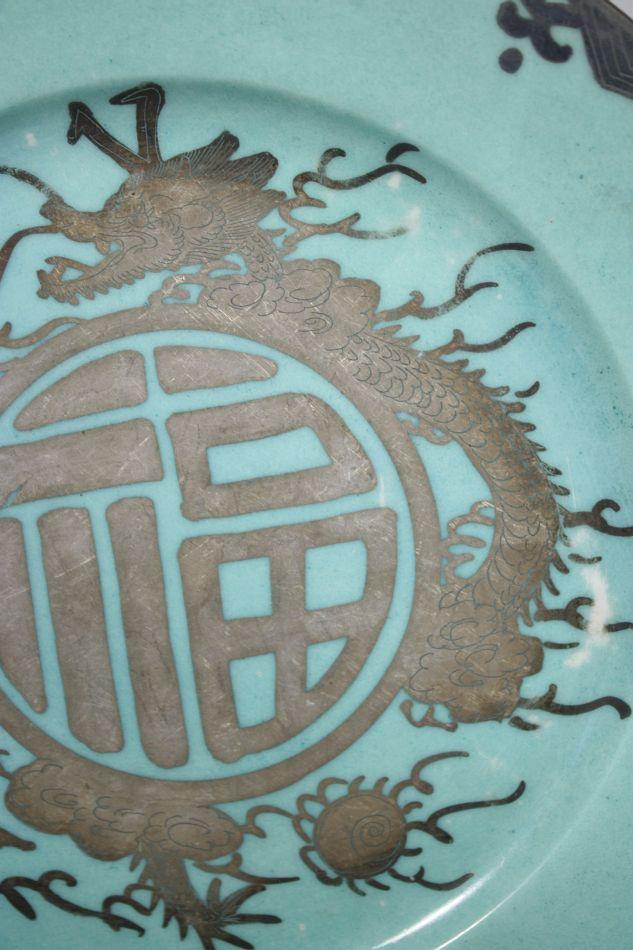 A Set of Five Japanese Porcelain and Silver Overlay Plates with Dragon Motif, Each Signed on Bottom.