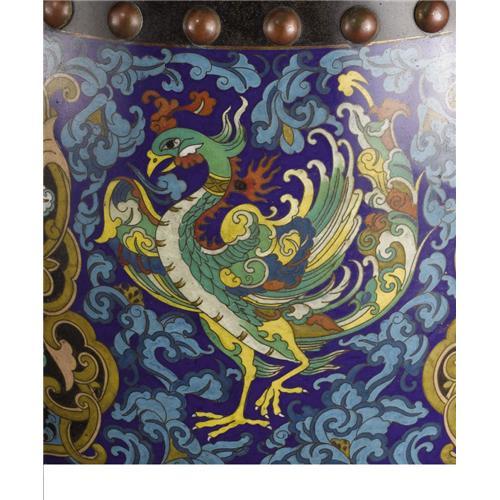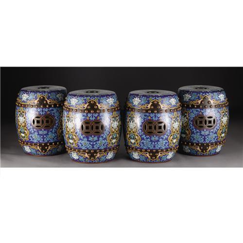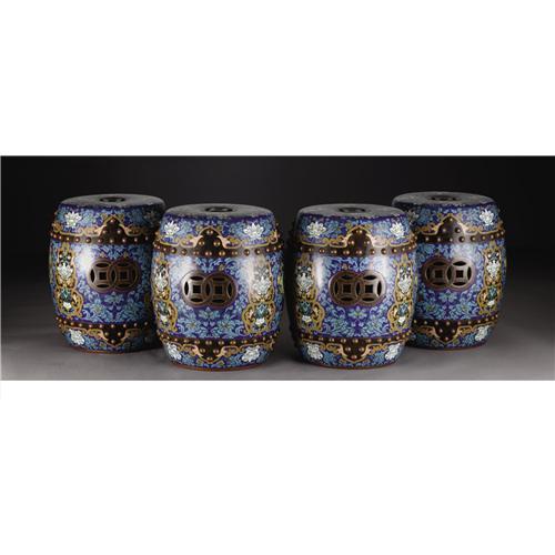 <B>A Set of Four Chinese Cloisonne Garden Seats</B></I><BR><BR>Unknown maker, China<BR>Nineteenth Century<BR>Cloisonne enamel<BR>Unmarked<BR>17.25 in. high<BR><BR>Of barrel-form with stylized blossoms amid scrolling foliage, with piercing to seat and sides, banded by scalloped bronze bands with raised circular bosses.